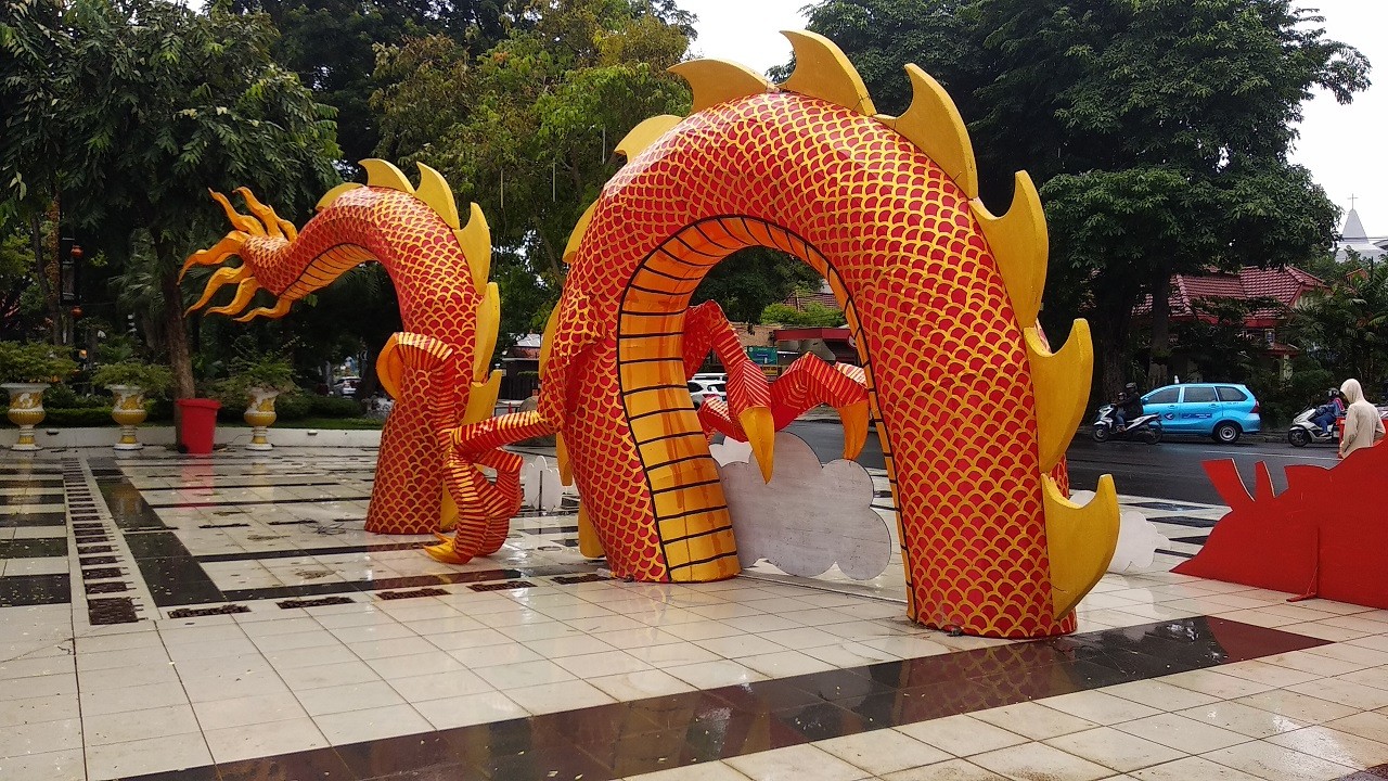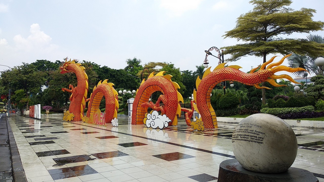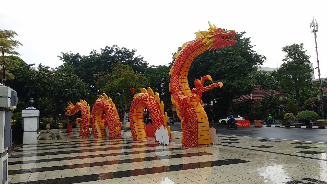 Salah satu yang menarik perhatian adalah ornamen naga raksasa yang dipasang di depan Balai Kota Surabaya. Naga tersebut memiliki panjang sekitar 25 meter dan tinggi sekitar 5 meter.