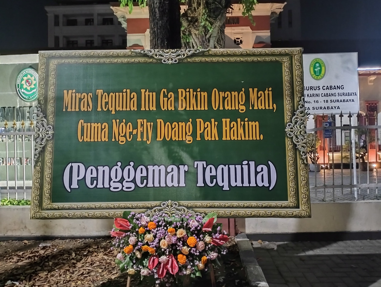 Adapun pesan menohok yang tertulis dalam karangan bunga tersebut yakni 'Miras Tequila itu Ga Bikin Orang Mati, cuma nge-Fly saja Pak Hakim (Penggemar Tequila)'.