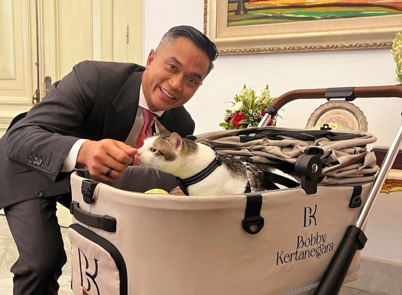 Kucing berwarna putih hitam itu telah berada di istana bersama stroller coklat lengkap dengan ukiran namanya. Nampak dalam unggahan, Prabowo yang masih mengenakan jas biru tua juga menyempatkan bermain-main dengan Bobby.