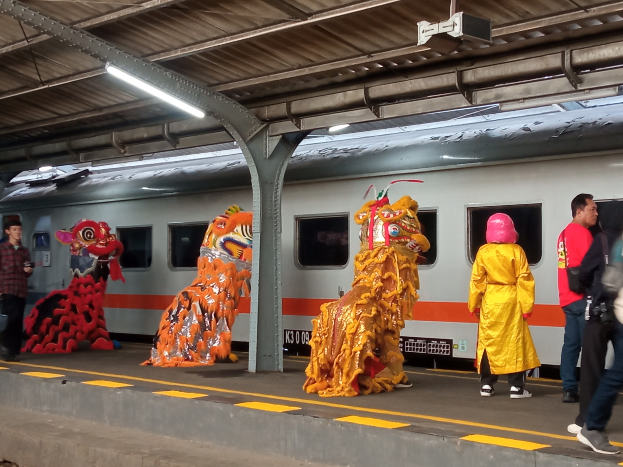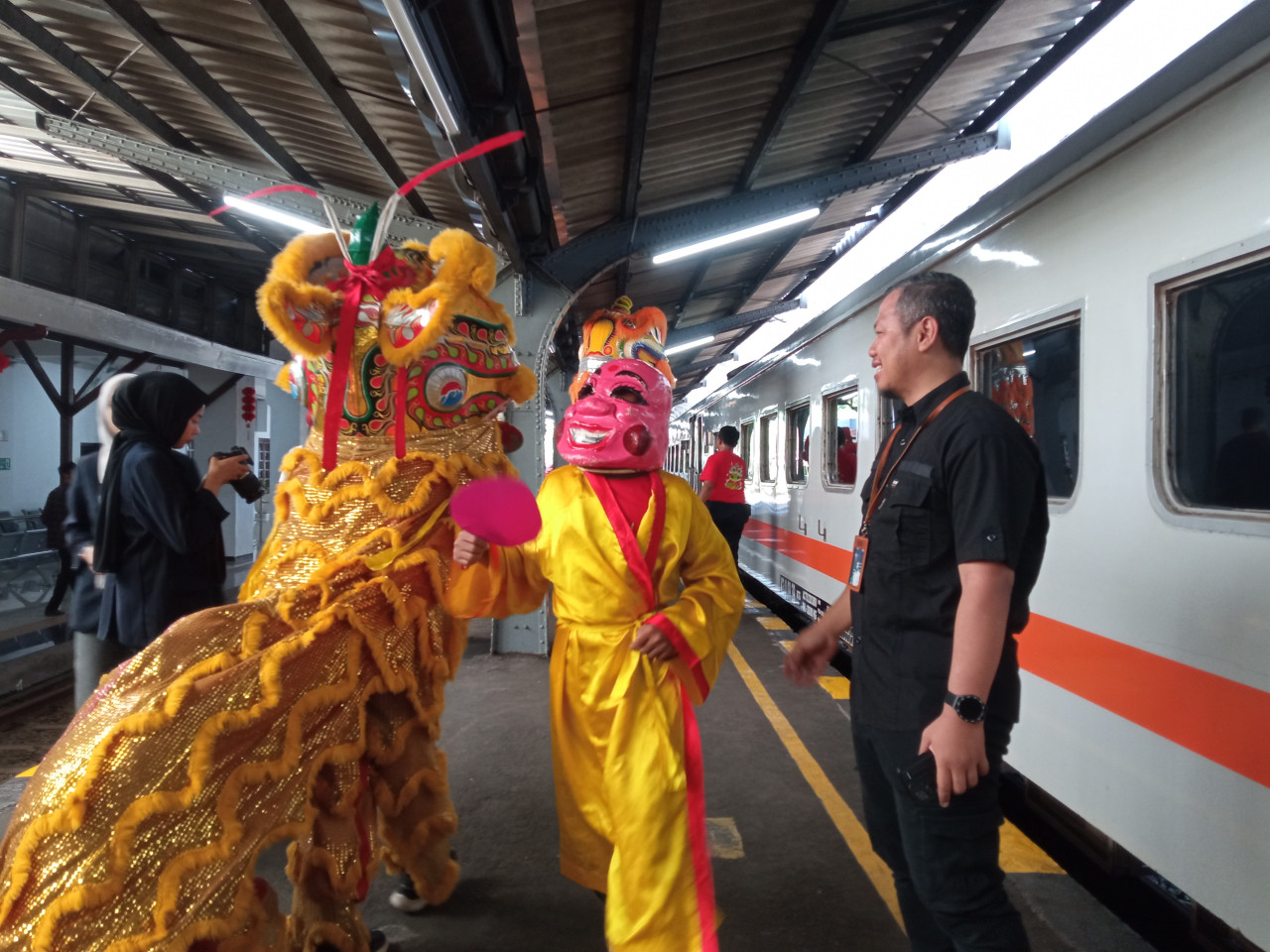 jatimnow.com - Daop 9 Jember menghadirkan Barongsai Naga Langit untuk menghibur pengantar dan penumpang kereta api di Stasiun Jember di momen Tahun Baru Imlek 2576 Kongzili.