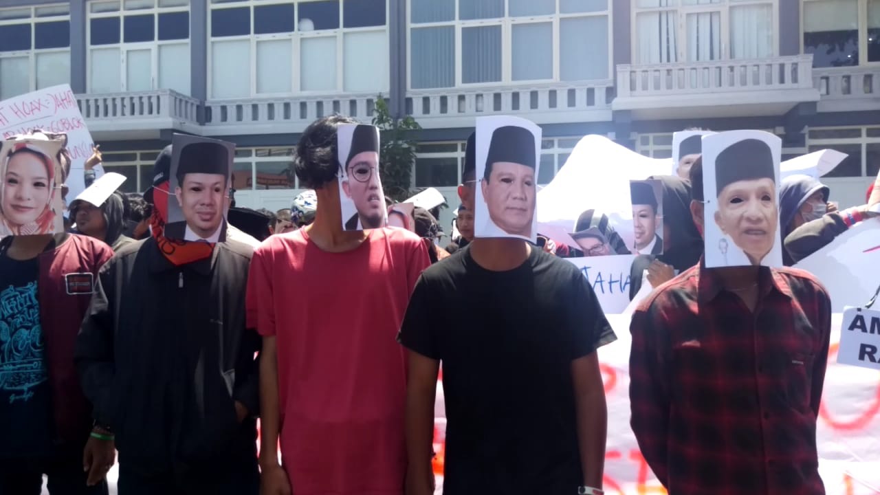 Tepat di depan tulisan itu, mereka meletakkan topeng wajah Ratna Sarumpaet, Prabowo Subianto, Sandiaga Uno, Amin Rais, Fadli Zon, Fahri Hamzah, Dahnil Anzar hingga Rachel Maryam dll.
