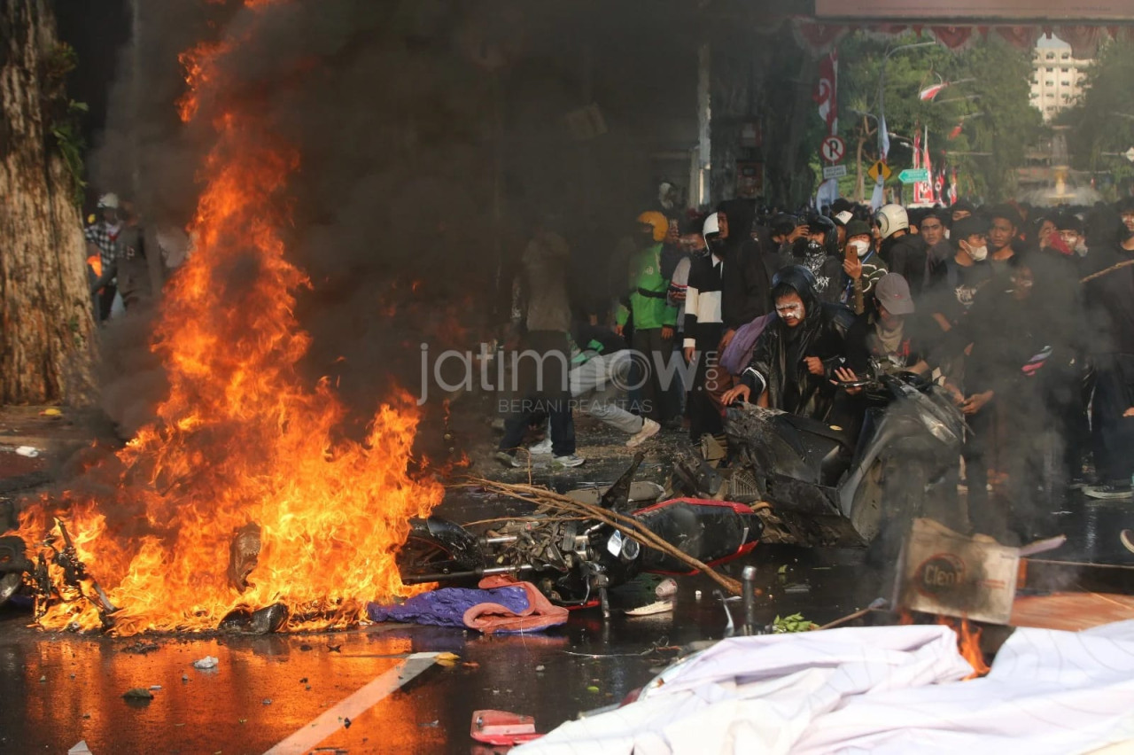Saling lempar batu, merobohkan pagar Grahadi hingga aksi bakar motor pun tak dapat dihindarkan.