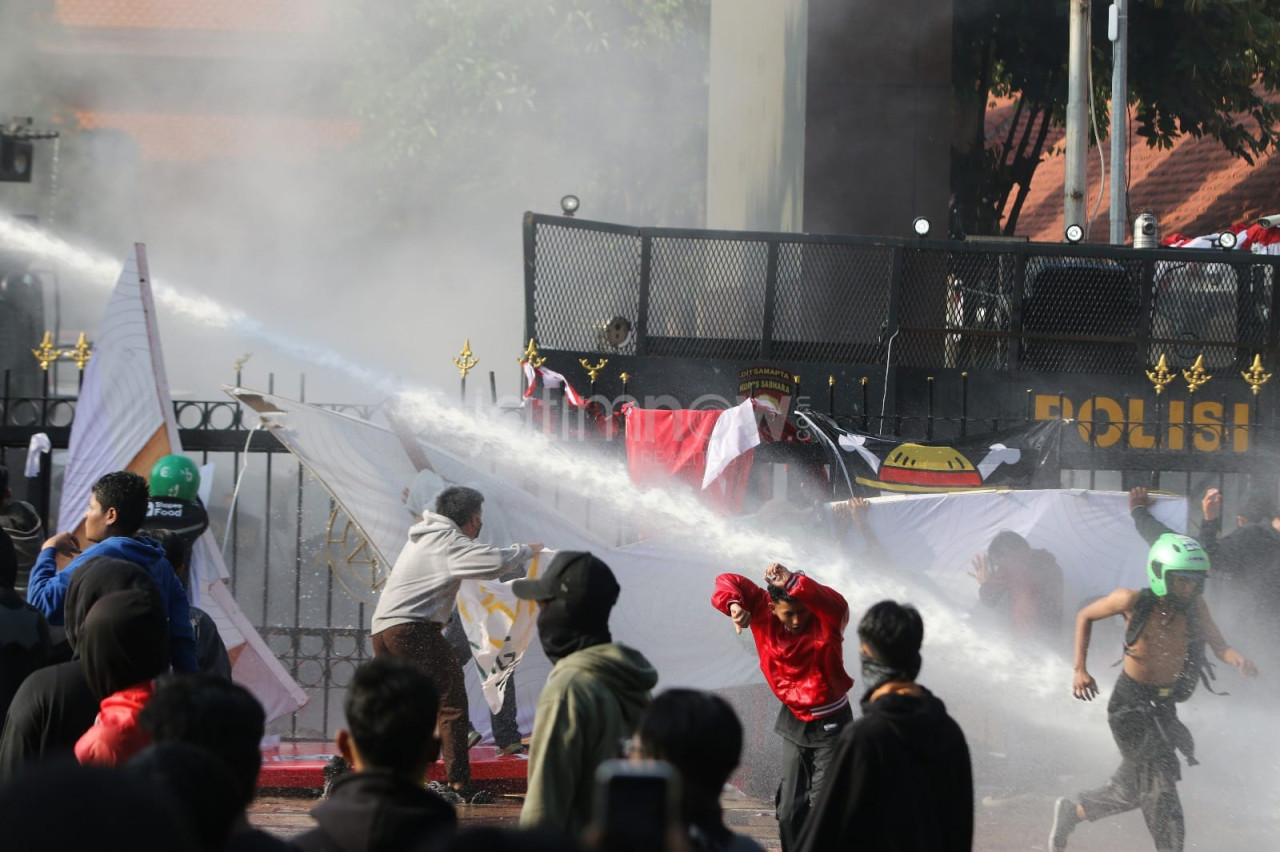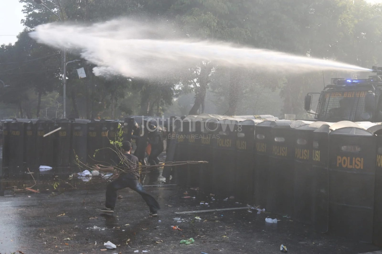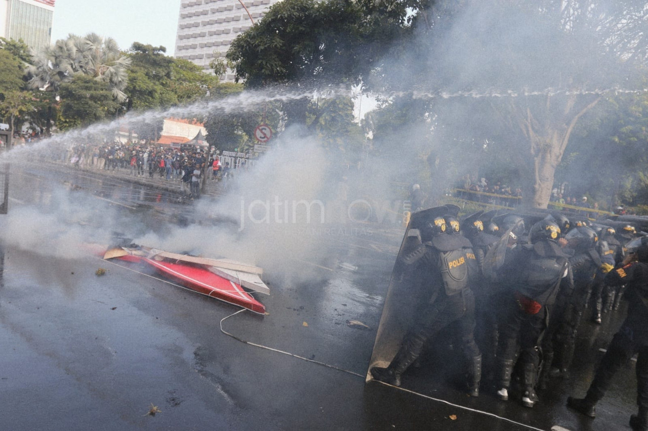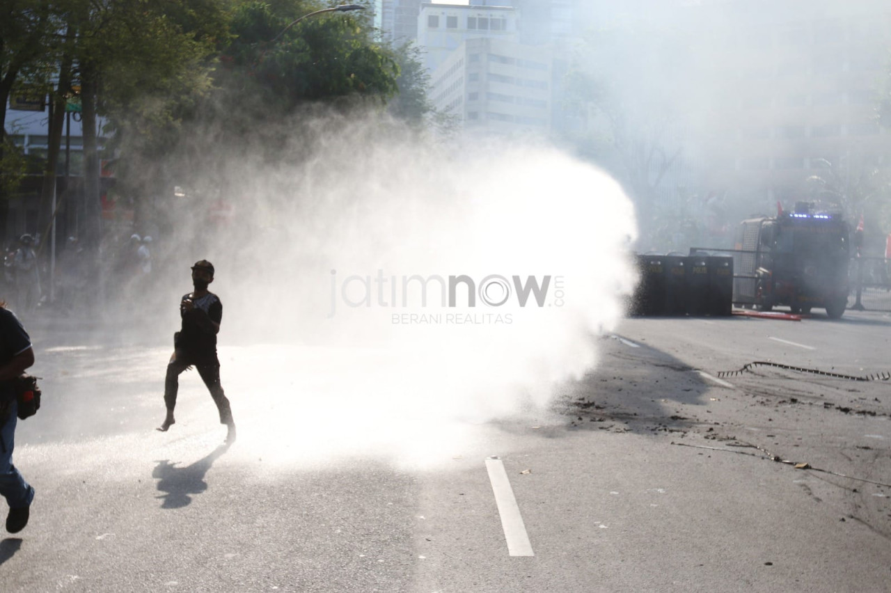Foto 2 : Massa menghindari semprotan water canon dari mobil petugas (Ridhoi/jatimnow.com)