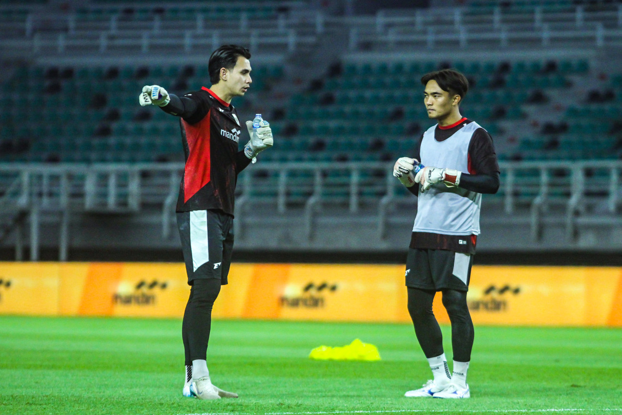 Foto: Kiper Timnas Indonesia Nadeo Arga Winata (kiri) dan Ernando Ari (kanan) berdiskusi dalam latihan resmi FIFA Matchday di Stadion Gelora Bung Tomo Surabaya, Kamis (4/9/2025). (Sahlul Fahmi/jatimnow.com)