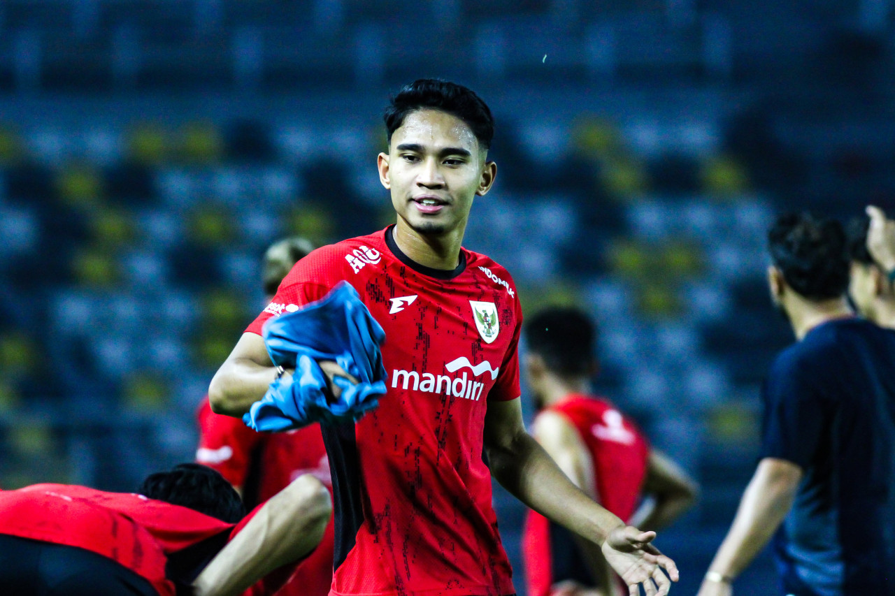 Foto: Pemain Timnas Indonesia Marselino Ferdinan dalam latihan resmi FIFA Matchday di Stadion Gelora Bung Tomo Surabaya, Kamis (4/9/2025). (Sahlul Fahmi/jatimnow.com)