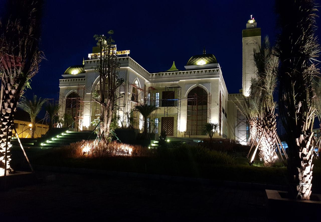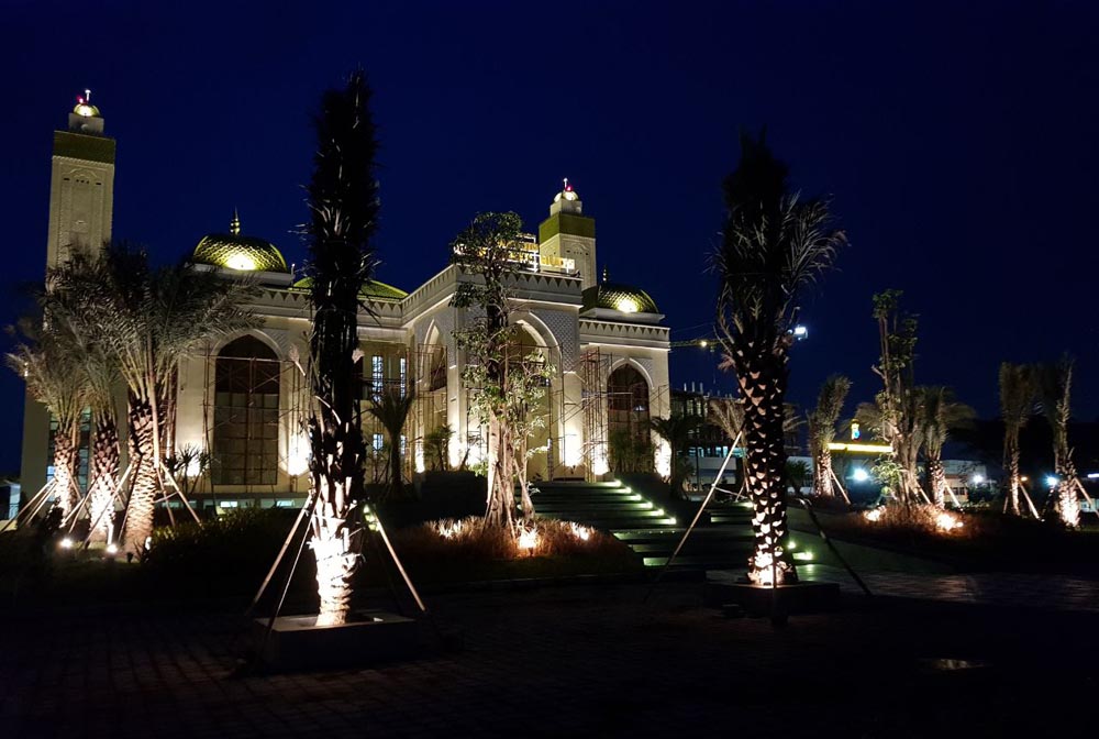 Di bagian depan masjid terdapat kolam ikan yang sudah didesain ciamik. Begitupula taman yang mengepung masjid yang hampir 100 % rampung ini sungguh menakjubkan. Pohon Kurma yang mengitari masjid akan menjadikan kawasan masjid ini juga bisa menjadi wisata religi.