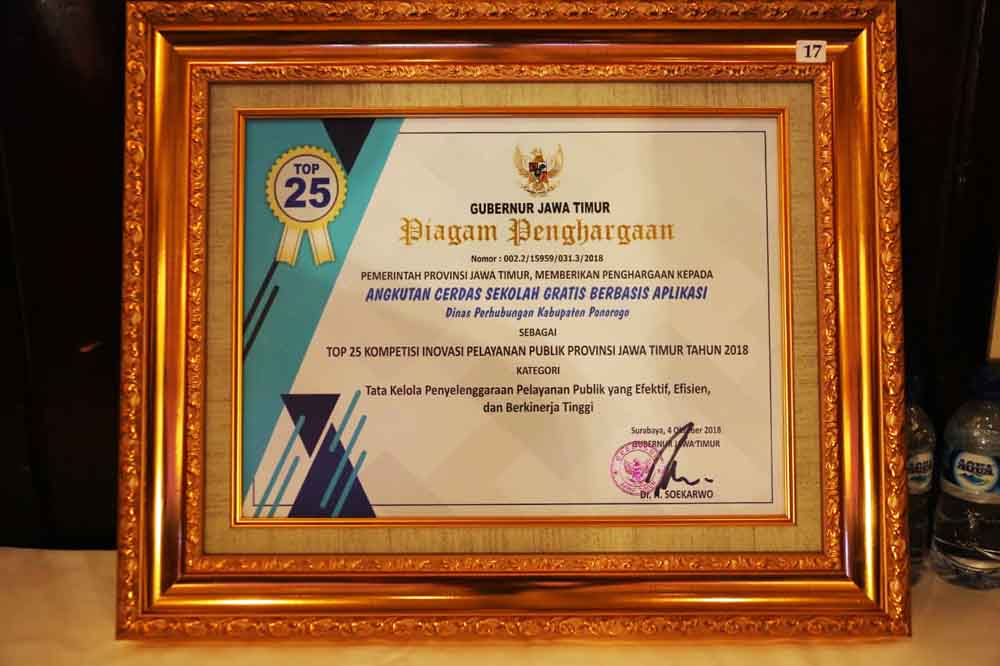 Untuk penghargaan pertama didapat pada Kompetisi Inovasi Pelayanan Publik (Kovablik) Tingkat Jawa Timur 2018. Penghargaan tersebut diterima Bupati Ponorogo Ipong Muchlissoni dari Gubernur Jawa Timur, Soekarwo di Hotel Shangri-La Surabaya, Senin (22/10/2018) malam.