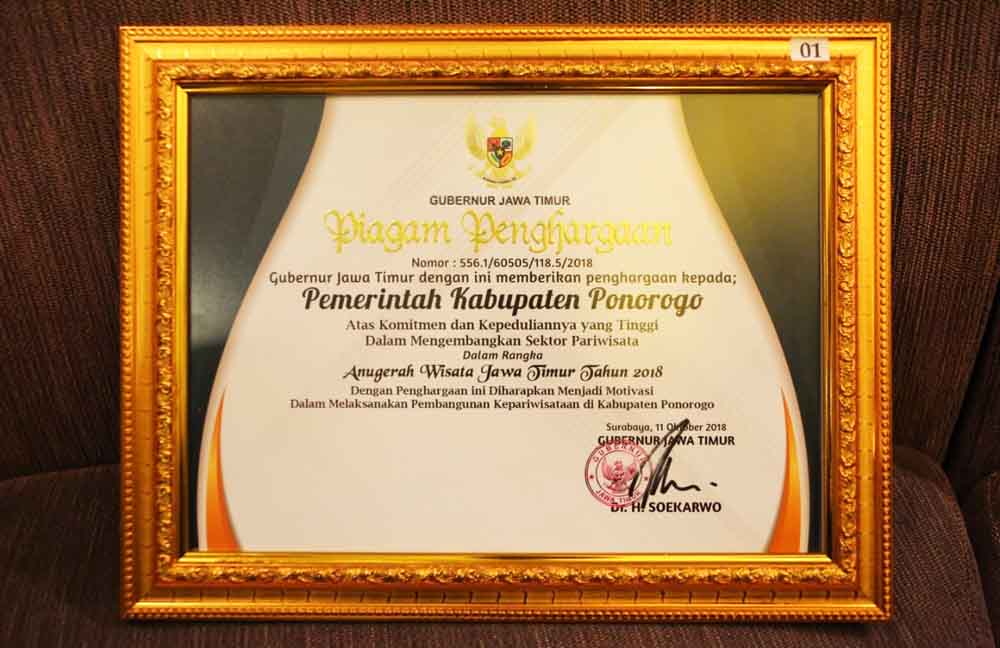 Sementara penghargaan kedua, Pemkab Ponorogo menyabet anugerah wisata pada hari Selasa (23/10/2018) di hotel Mercure Surabaya. Ponorogo menjadi salah satu Pemkab yang berkomitmen mengembangkan wisata.