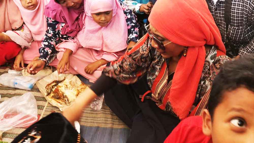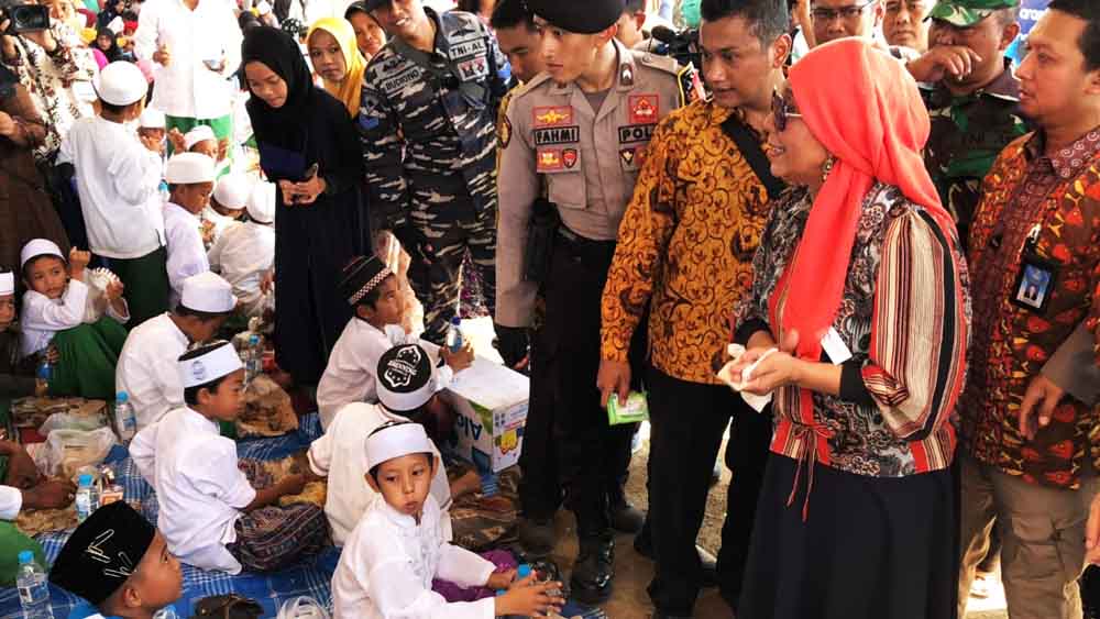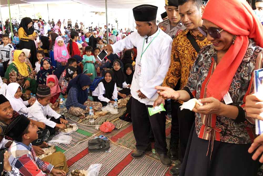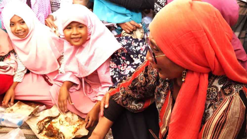 Acara makan ikan ini berlangsung meriah. Bu Susi menyapa para santri. Bahkan, menteri perikanan perempuan pertama di Indonesia ini turun dari panggung dan ikut menyuapi anak-anak untuk makan ikan.