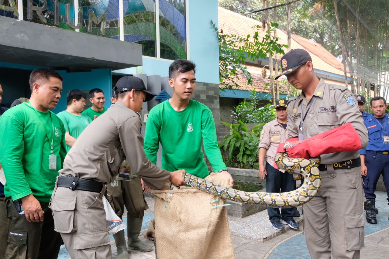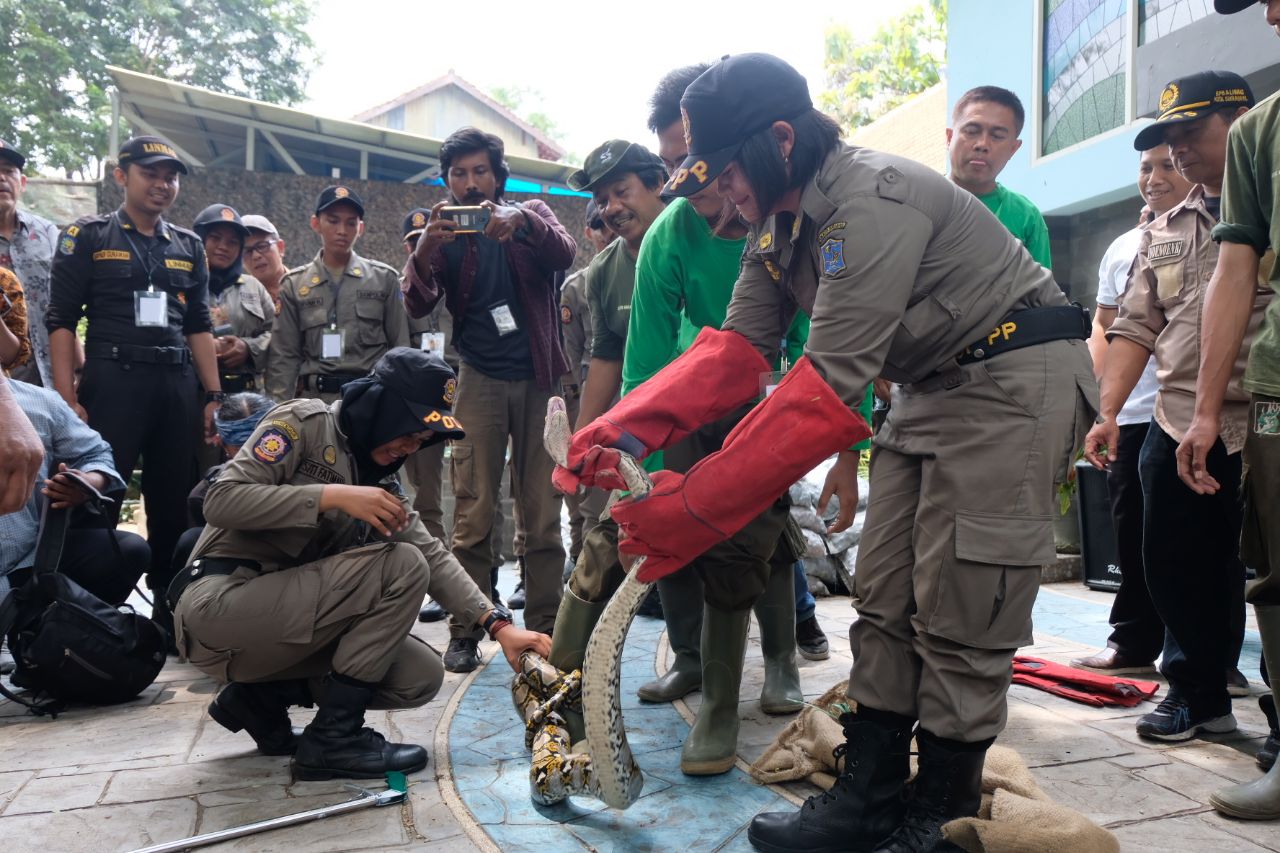 Petugas Satpol PP perempuan ini berusaha mengevakuasi ular yang telah ditangkap
