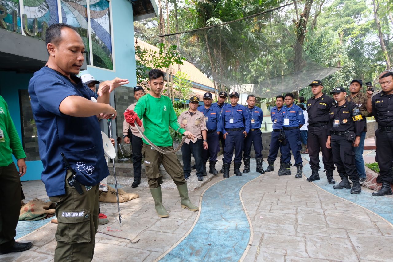 Beginilah serunya, jika aparat gabungan yang terdiri dari Linmas, Satpol PP, dan Pemadam Kebakaran, menggelar latihan bersama dengan Kebun Binatang Surabaya (KBS), Rabu (21/3/2018).