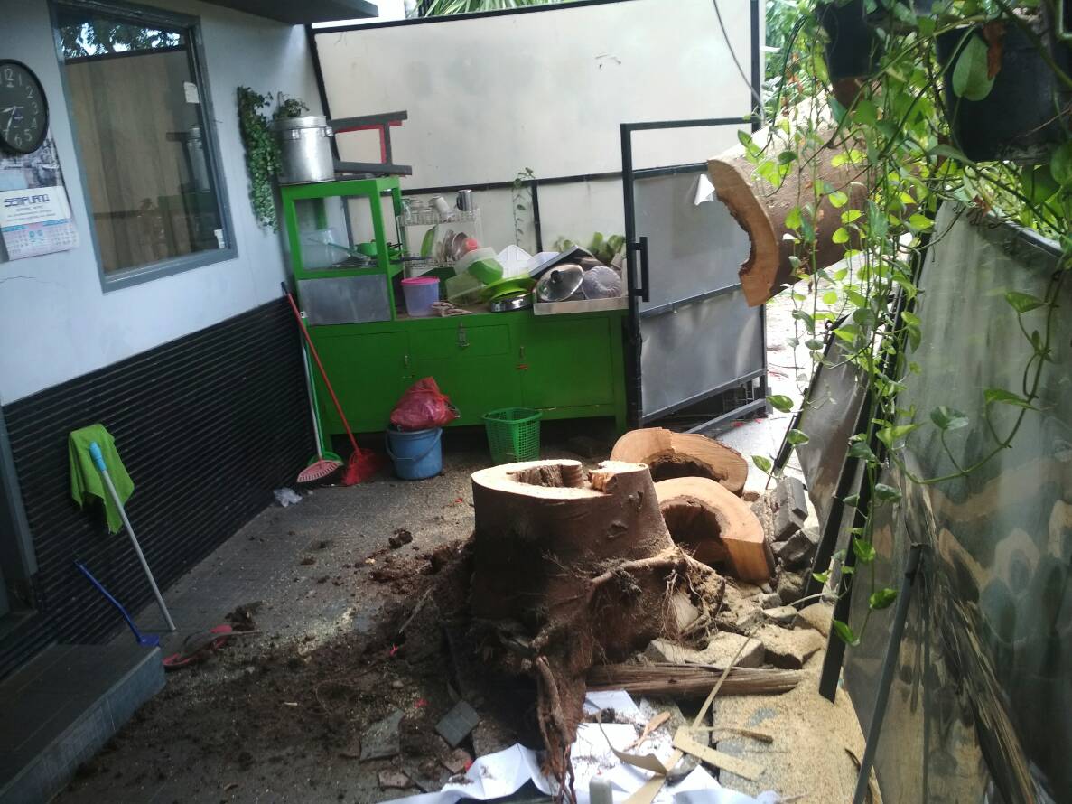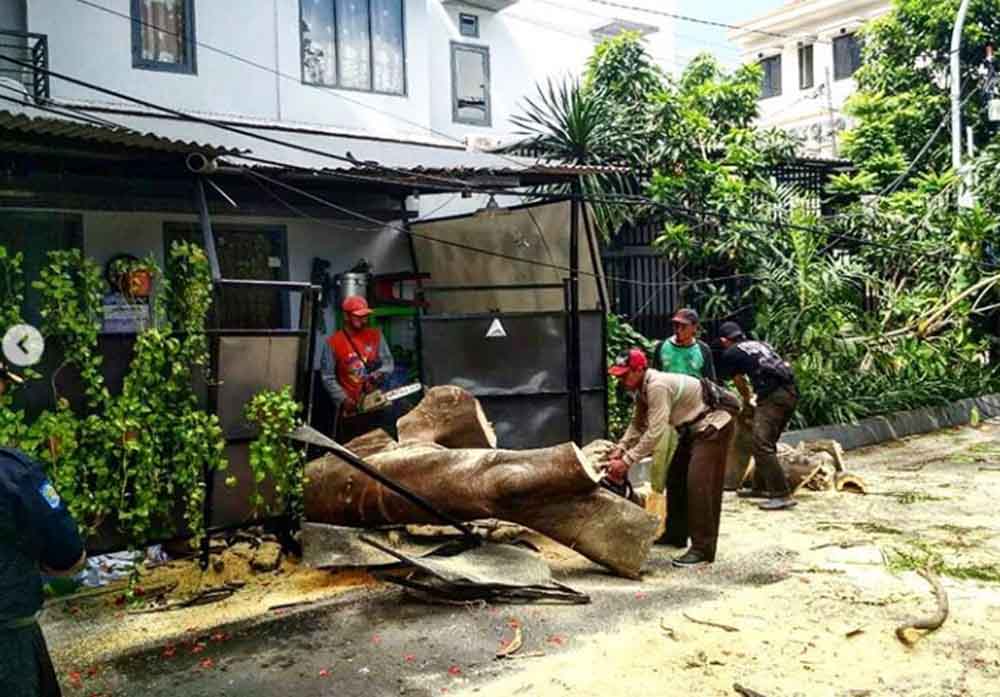 jatimnow.com - Pohon di Perumahan Wisma Permai II No 12, Surabaya, tumbang setelah diterjang angin kencang, Rabu (5/11/2018).
