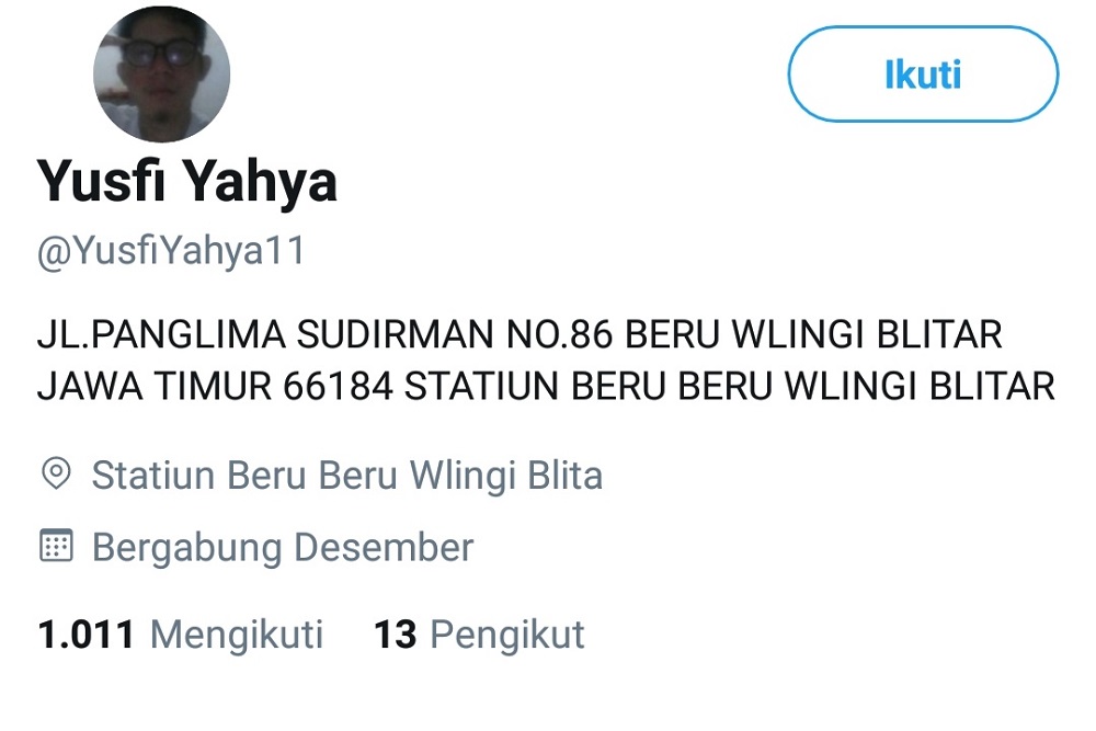 Belum diketahui siapa pemilik dari akun tersebut. Namun, pemilik menuliskan sebuah alamat yakni Jln. Panglima Sudirman No. 86 Beru, Wlingi, Blitar, Jawa Timur, 66184. Akun yang diketahui dibuat pada bulan Desember 2018 tersebut diikuti oleh 13 orang dan mengikuti 1.011 akun Twitter lain.