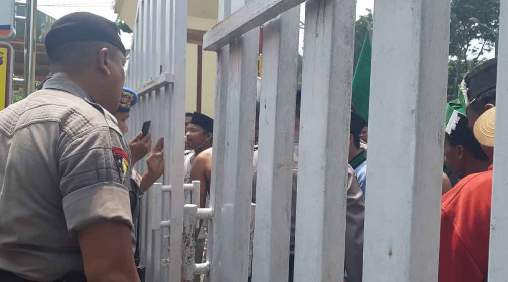 Massa yang merangsek masuk ke Mapolda Jatim akhirnya terlibat gesekan dengan sejumlah polisi yang berjaga. Sebab pintu gerbang Mapolda Jatim ditutup.