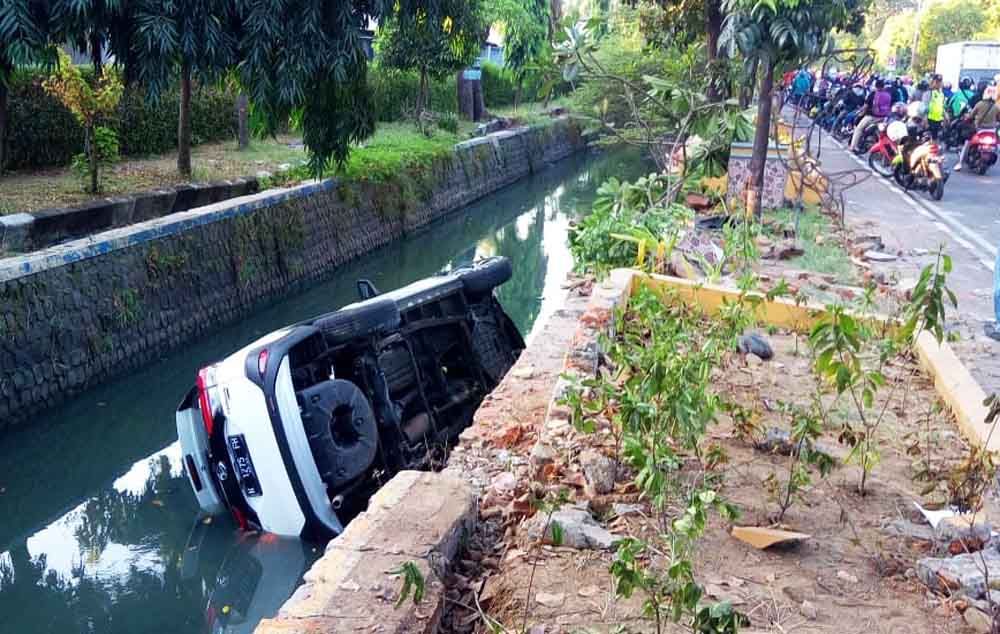 "Saat saya melaju tiba-tiba ada pemotor yang berhenti mendadak di depan. Saya langsung banting stir ke kiri, khawatir tertabrak lebih parah," jelas sopir mobil yang tercebur, Iwan Supriyadi.
