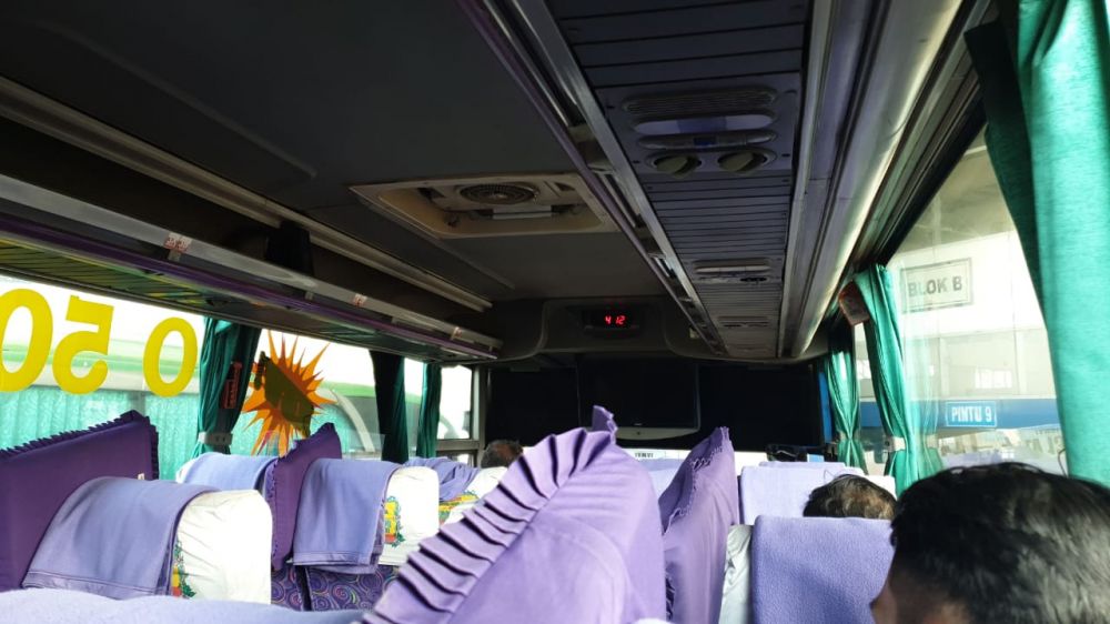 Setelah barang bawaan ditaruh di bagasi, kami pun akhirnya masuk ke dalam kabin bus dan duduk di kursi 4A dan 4B sesuai kode booking. Saat kami berada di dalam bus dengan kondisi mesin sudah dinyalakan, kami merasakan bahwa AC bus dimaksud belum menyala.