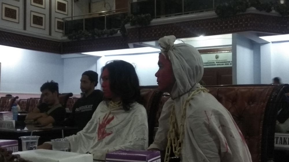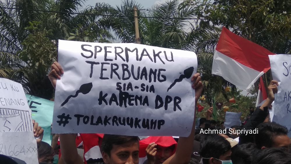 Mereka juga membawa berbagai poster diantaranya: "DPR koyok kipas angin tolah toleh tok (DPR kayak kipas angin tolah toleh aja)"; RUU KUHP membuat para suami takut melakukan sunah Rosul". Selain membawa poster, mereka juga membawa keranda dan kuburan.