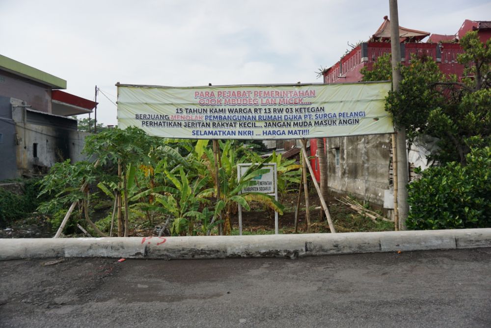 Sedikitnya 8 spanduk berisi penolakan warga atas pembangunan rumah duka untuk tempat penyimpanan dan pembakaran mayat yang berada di Kelurahan Ketegan, Kecamatan Taman, Kabupaten Sidoarjo.