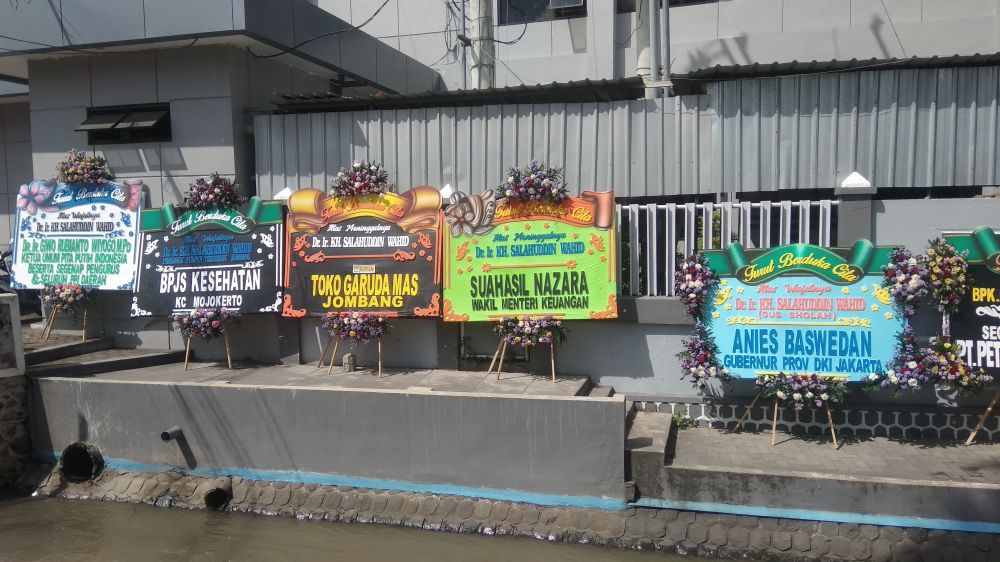 Karangan bunga ucapan belasungkawa terlihat berjejer dan memenuhi Pondok Pesantren Tebuireng, Cukir, Kabupaten Jombang tempat akan dimakamkan Gus Solah.