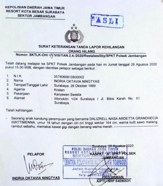 Disebutkannya, dalam laporan siswi SMP itu diketahui bernama Dalizrell Nasa Ardetta Grandhecia Wattimenna (16), asal Bibis Karah Surabaya. Sementara ibu korban bernama Indria Oktavia Ningtyas (40).