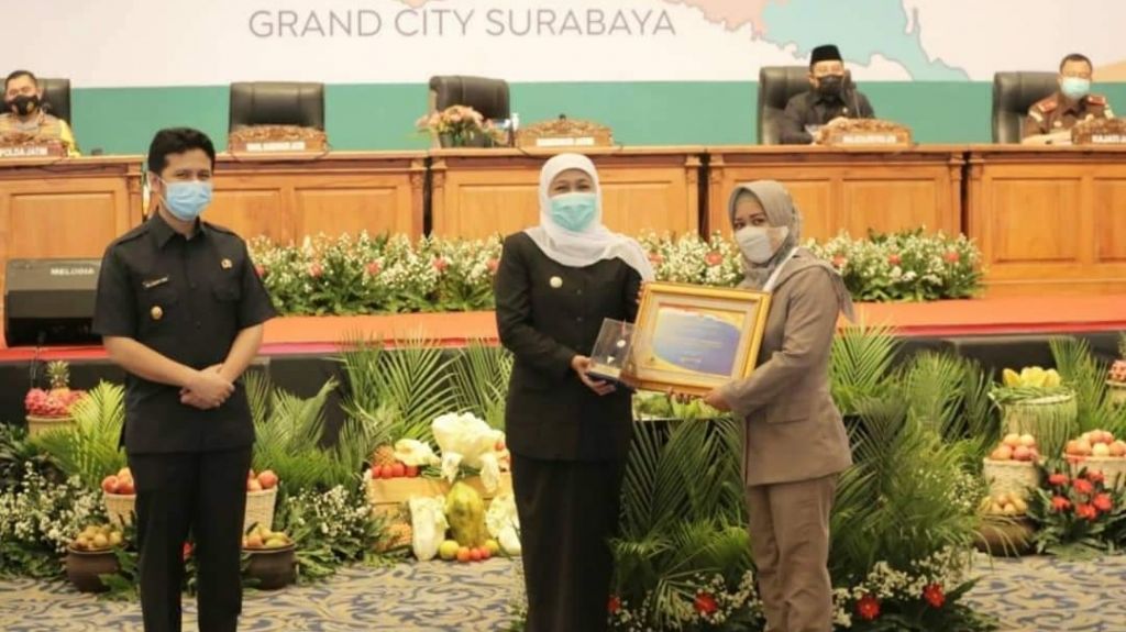 Penghargaan diserahkan oleh Gubernur Jawa Timur Khofifah Indar Parawansa kepada Wali Kota Mojokerto Ika Puspitasari di Convention Hall, Grand City Kota Surabaya, Senin (19/10).