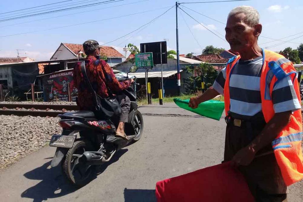Dengan menggunakan dua bendera warna hijau dan merah, kakek berusia 55 tahun itu memandu para pengguna jalan yang akan melintasi rel KA.
