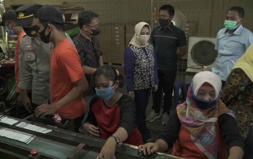 Didampingi Kepala Dinas Koperasi, Usaha Kecil Menengah, Perindustrian dan Perdagangan (Diskoukmperindag) Kota Mojokerto Ani Wijaya, Ning Ita juga melakukan peninjauan proses produksi rokok yang dikerjakan mayoritas karyawan perempuan.