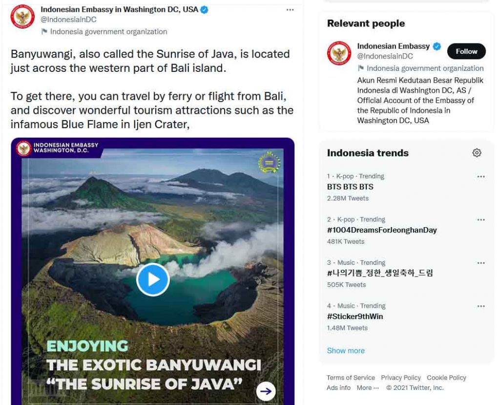 Melalui akun resmi media sosialnya masing-masing, KBRI di berbagai negara mengunggah destinasi pariwisata Banyuwangi.