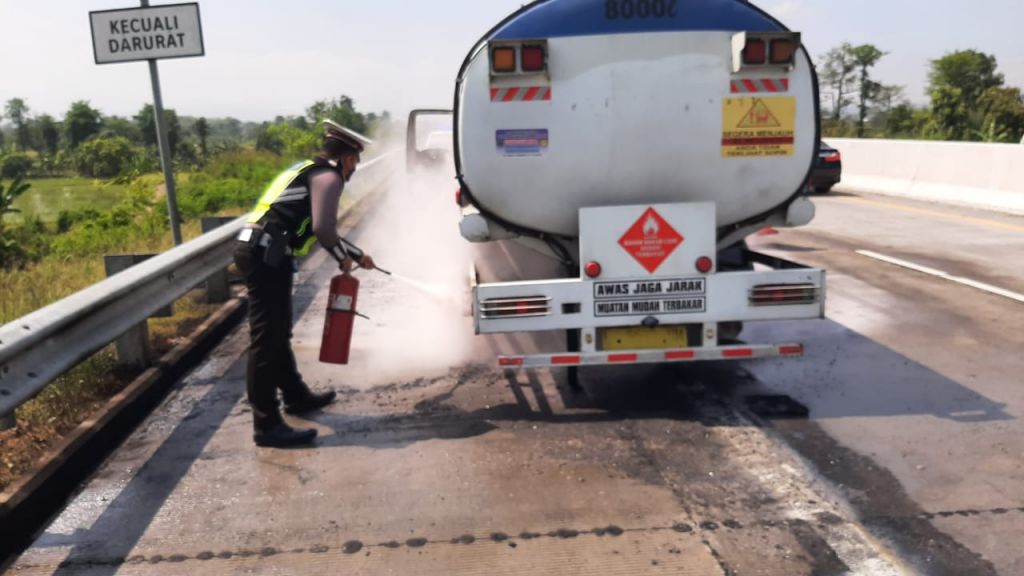 Saat di KM 59.400/A, di belakang kap mesin keluar percikan api dan kemudian membesar hingga membakar kepala truk tangki yang kemudian berhenti di lajur 1.