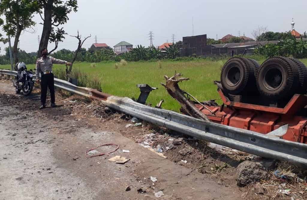 Sopir Mengantuk, Dump Truk Terbalik di Arteri Exit Tol Tanggulangin