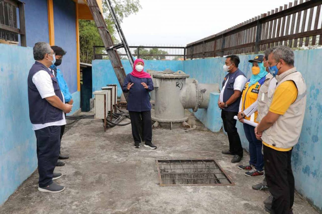 Khofifah yang didampingi Wakil Bupati Sampang Abdullah Hidayat, Kepala Dinas PU SDA Prov. Jatim M. Isa Anshori, Kadis PUCK Jatim Baju Trihaksoro dan Kalaksa BPBD Jatim Budi Santoso untuk memastikan kesiapan alat pompa air serta petugas jaga yang akan mengantisipasi banjir.