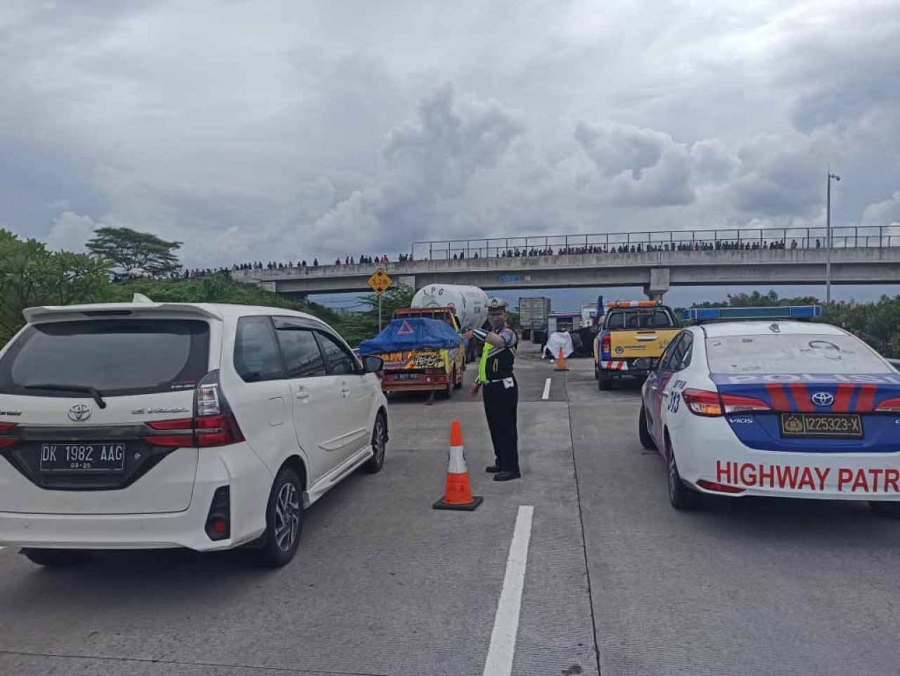 Saat di KM 786 Jalur B, diduga roda kendaraan mengalami selip sehingga kendaraan oleng ke kanan dan menabrak guardrill pembatas jalan hingga terbalik menghadap ke selatan berada di lajur cepat.