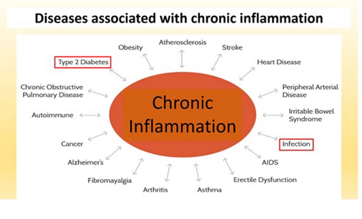 Keradangan yang berlebihan, sistemik atau bahkan yang meliputi seluruh tubuh dan berlangsung lama menimbulkan penyakit-penyakit kronis seperti obesitas, gastritis, hipertensi dan diabetes type 2.