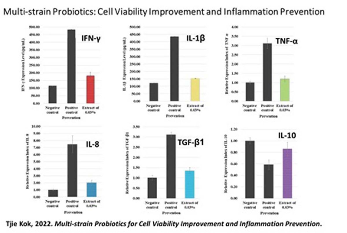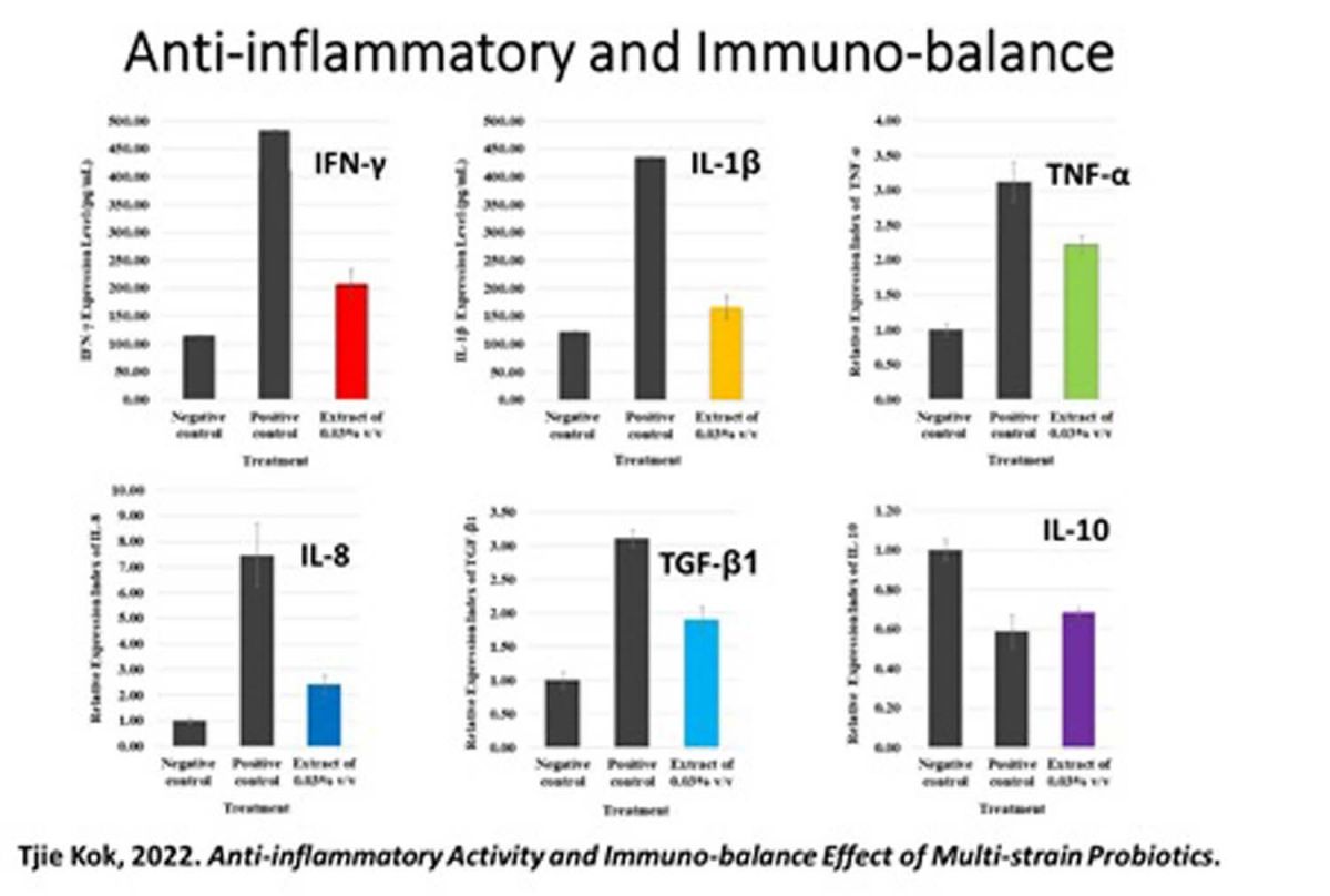 Setelah diberi ekstrak metabolit probiotik multistrain, keradangan mereda, yang ditandai dengan penurunan tingkat ekpresi sitokin proinflamasi dan peningkatan sitokin antiinflamasi sampai homeostasis atau seimbang, sebagai upaya tubuh untuk lebih cepat memulihkan dirinya sendiri.