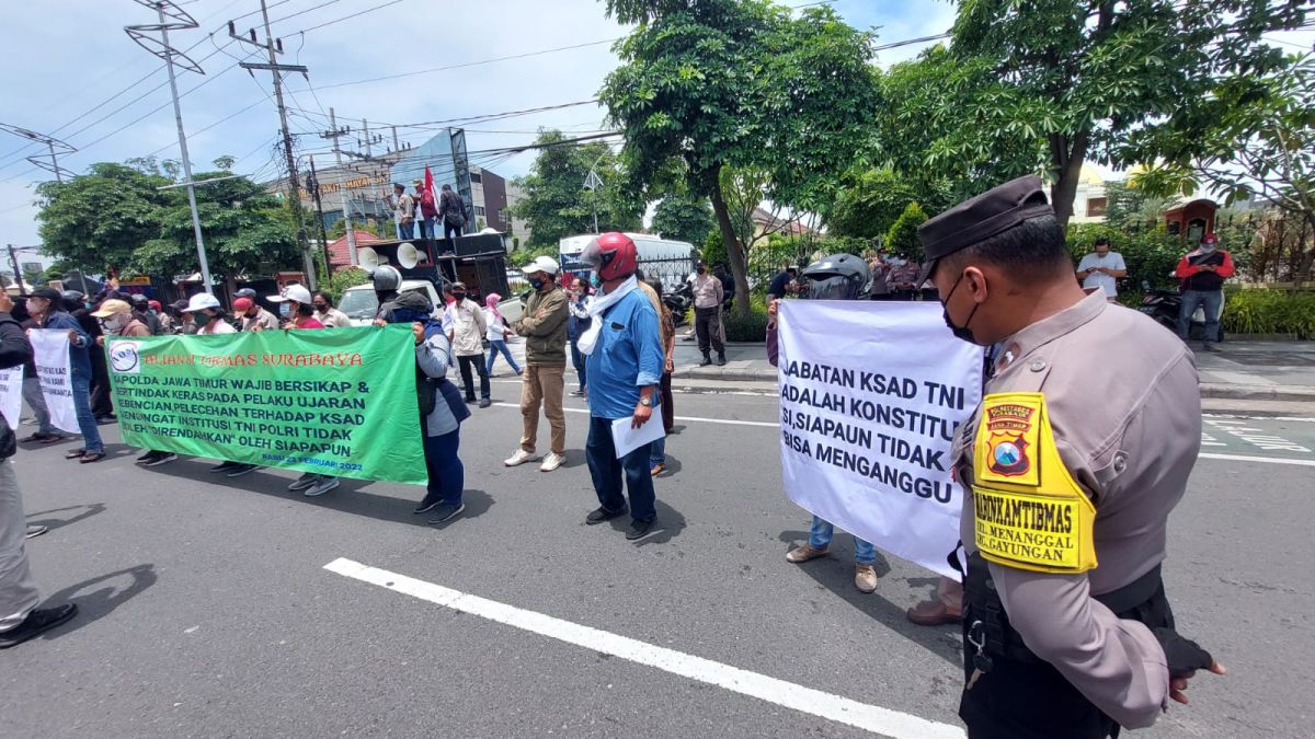 Peristiwa Rabu, 23 Feb 2022 14:18 WIBSurabaya - Sekelompok massa yang mengatasnamakan dirinya sebagai Masyarakat Peduli Keadilan melakukan aksi unjuk rasa di depan Mapolda Jatim, Rabu (23/2/2022). Mereka melaporkan akun media sosial yang menurut mereka melecehkan institusi TNI.