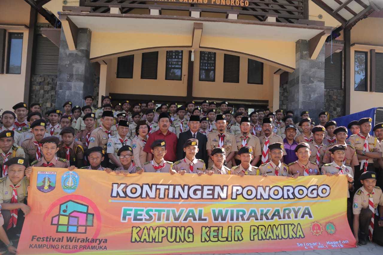 Pemerintahan Kamis, 05 Jul 2018 16:49 WIBjatimnow.com – Wakil Bupati Ponorogo Sudjarno yang juga Ketua Kwarcab Ponorogo memberangkatkan kontingen pramuka Ponorogo yang akan mengikuti Festival Wirakarya Kampung Kelir di Magetan. Prosesi pemberangkatan itu dilakukan di kantor Gerakan Pramuka Kwartir Cabang (Kwarcab) Ponorogo, Jalan Pramuka, Kamis (5/7/2018).