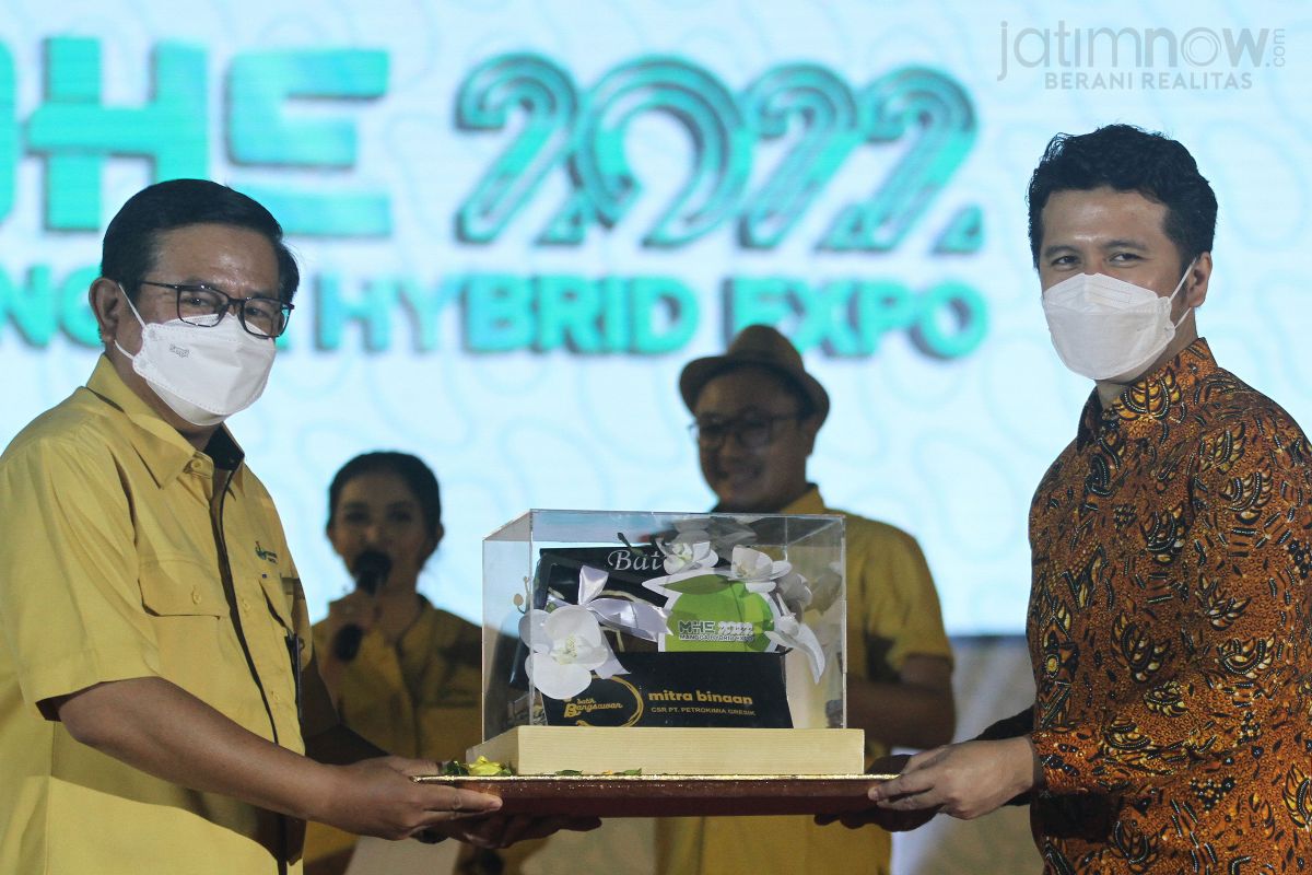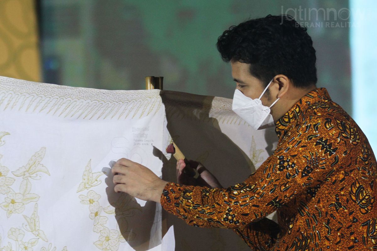 Gresik - Wakil Gubernur Jatim Emil Elestianto Dardak membuka acara Mangga Hybrid Expo (MHE) 2022 di Gedung Tri Dharna PT Petrokimia Gresik, Rabu (29/6/2022). Emil menggoreskan canting di atas bahan kain batik salah satu UMKM binaan Petrokimia Gresik.