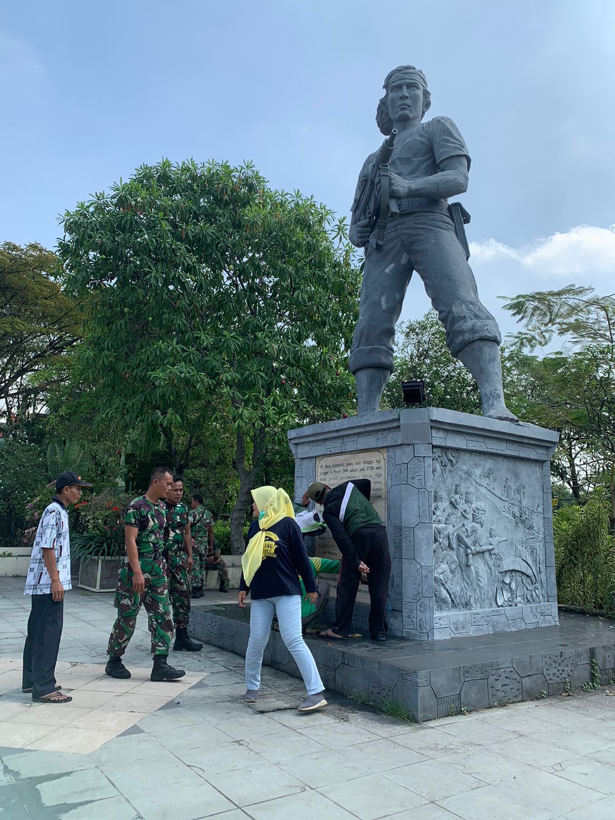 Terlihat beberapa petugas dari Kodim 0812 Lamongan dan Pemkab Lamongan dalam hal ini Dinas Lingkungan Hidup (DLH) langsung membersikan vandalisme yang merekat kuat di bagian monumen patung tersebut.