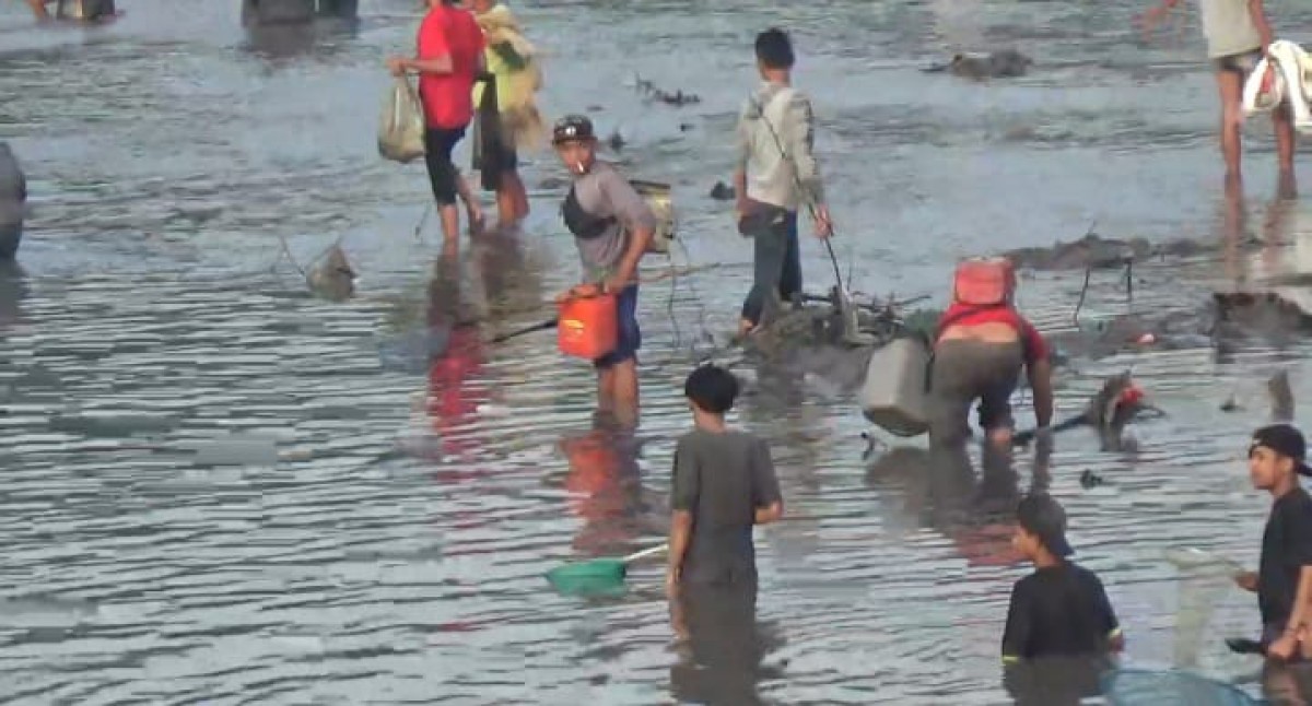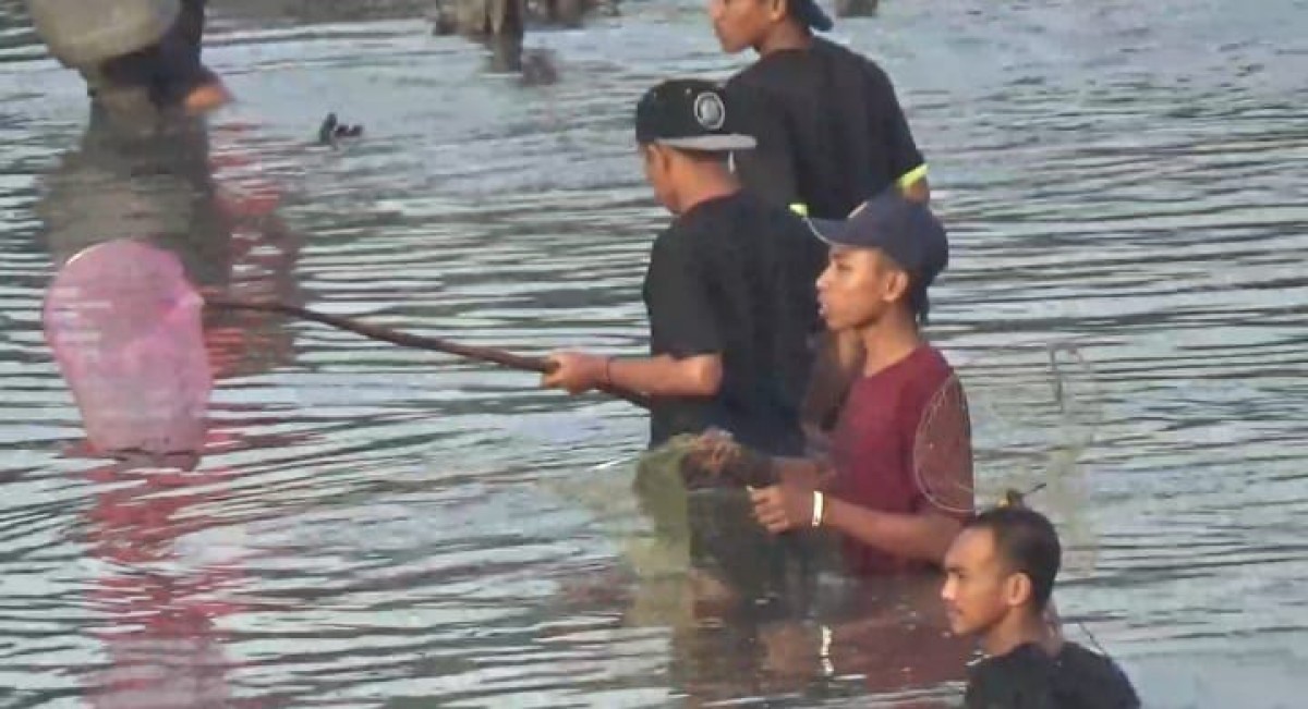 Terlihat ratusan warga turun ke sungai menggunakan peralatan sederhana. Mereka beramai-ramai menangkap ikan untuk dikonsumsi sendiri.