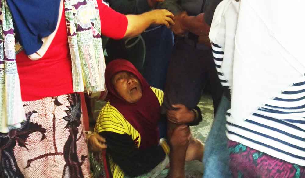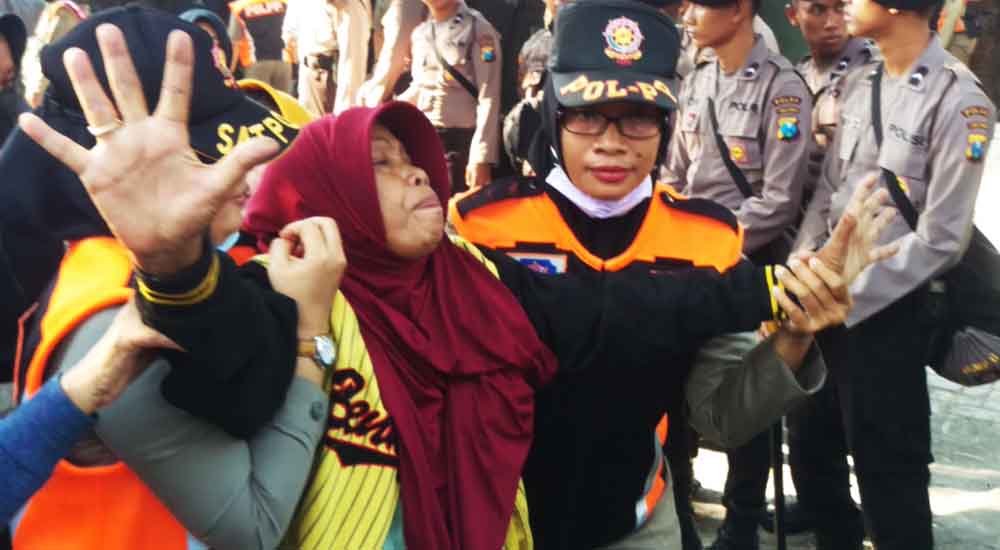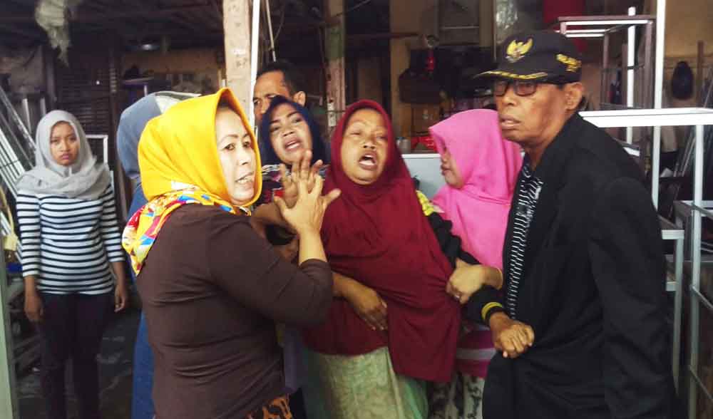 Ibu Romli, salah satu pemilik tempat usaha yang ditertibkan melawan petugas dan menangis histeris menolak tempat usahanya dirobohkan.