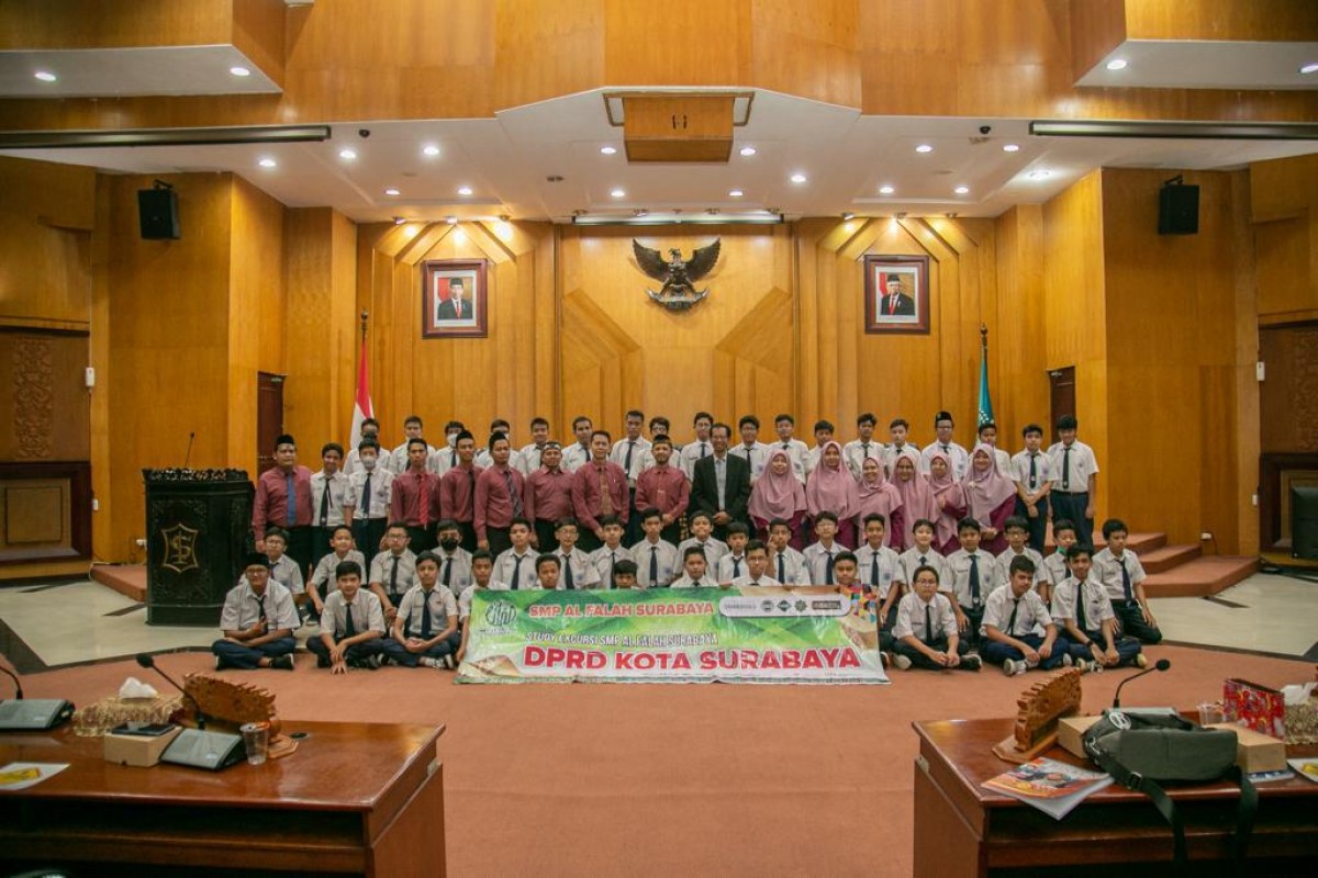 "Selamat datang di Kantor DPRD. Ini adalah rumah rakyat Kota Surabaya. Siapapun boleh datang, termasuk anak-anak sekalian para pelajar SMP Al-Falah," ujar Adi.