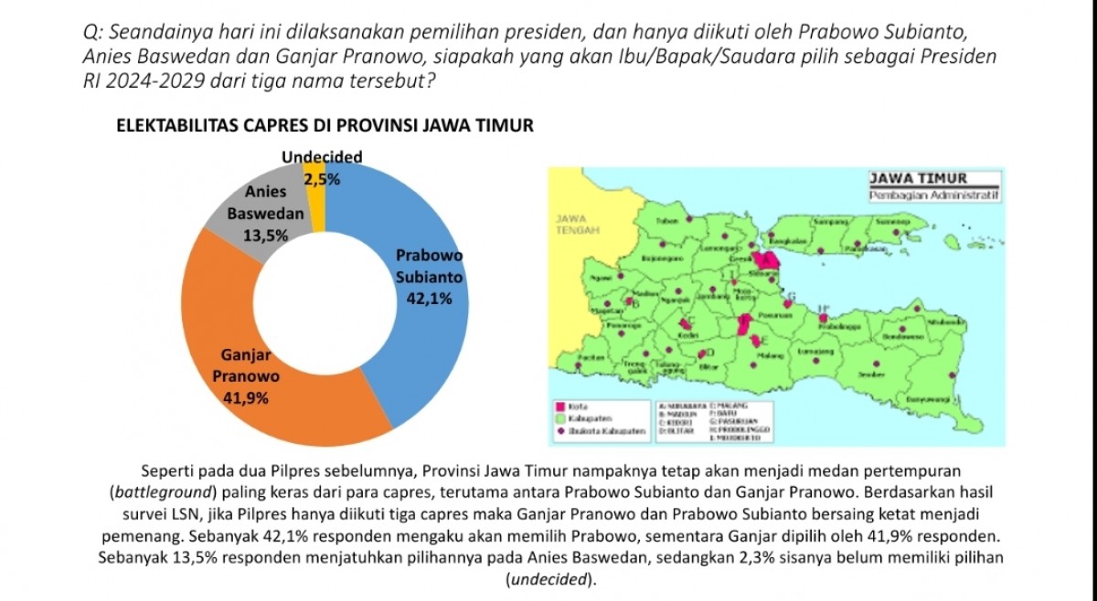 Berdasarkan hasil survei LSN, jika Pilpres hanya diikuti tiga capres maka Prabowo Subianto dan Ganjar Pranowo bersaing ketat menjadi pemenang. Sebanyak 42,1% responden mengaku akan memilih Prabowo, sementara Ganjar dipilih oleh 41,9% responden.