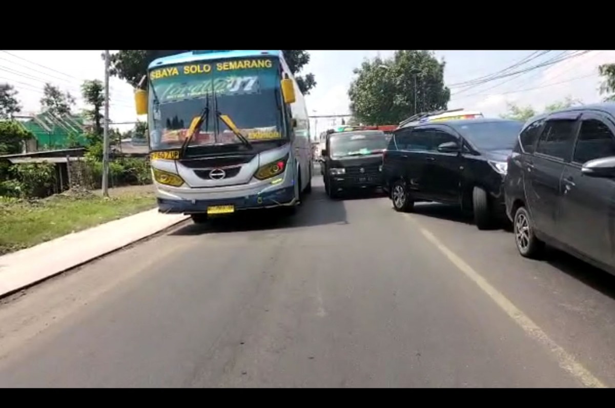 Bus jurusan Surabaya-Semarang dan pikap itu dipukul mundur karena membuat jalur dari arah Jombang-Surabaya macet, tepatnya di perlintasan kereta api.