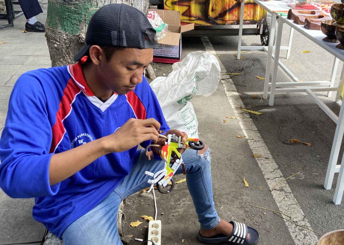 Time Out Kamis, 19 Jan 2023 14:57 WIBjatimnow.com - Miniatur motor gede berbahan kayu setengah jadi itu dipegangnya dengan tangan kiri. Setelah memutar ujung topinya ke belakang, matanya fokus sembari tangan kanannya menyapukan kuas berwarna merah membentuk motif api di bagian tangki.