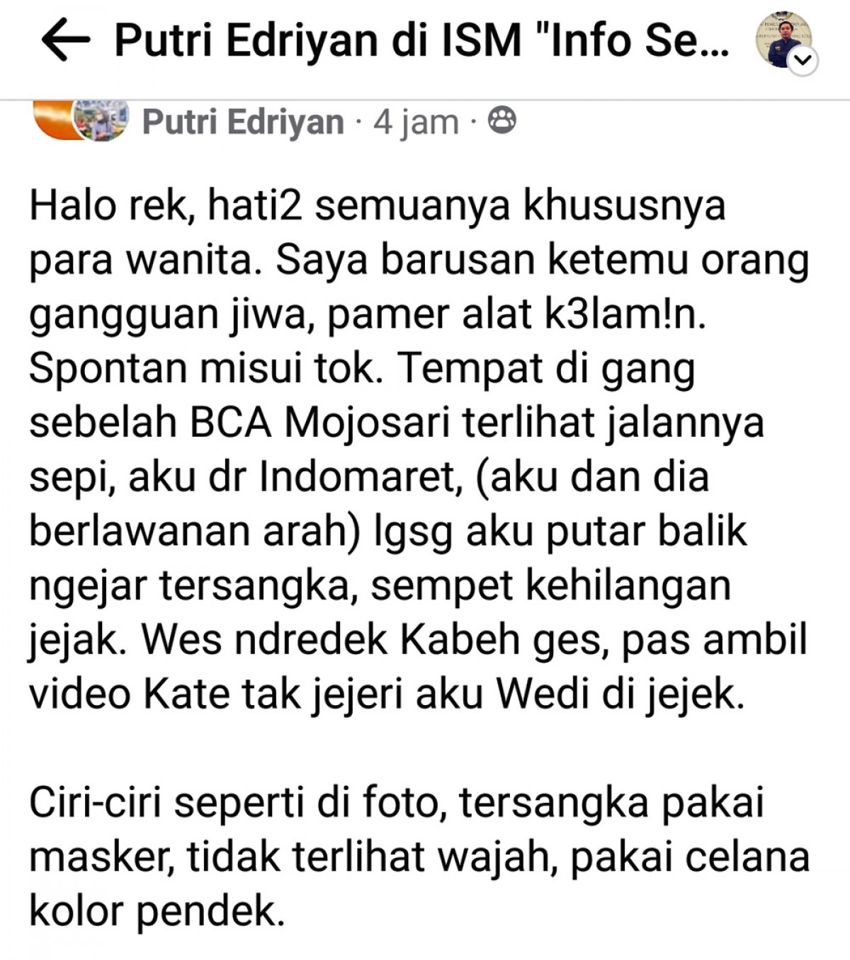 "Halo rek, hati2 semuanya khususnya para wanita. Saya barusan ketemu orang gangguan jiwa, pamer alat k3lam!n. Spontan misui (mengumpat) tok. Tempat di gang sebelah BCA Mojosari terlihat jalannya sepi, aku dr Indomaret, (aku dan dia berlawanan arah) lgsg aku putar balik ngejar tersangka, sempet kehilangan jejak. Wes ndredek Kabeh ges, pas ambil video Kate tak jejeri aku Wedi di jejek (sudah gemetar semua, pas ambil video mau disejajarkan tapi aku takut ditendang)," tulisnya dalam keterangan unggahan seperti yang dilihat jatimnow.com, Selasa (31/1/2023).