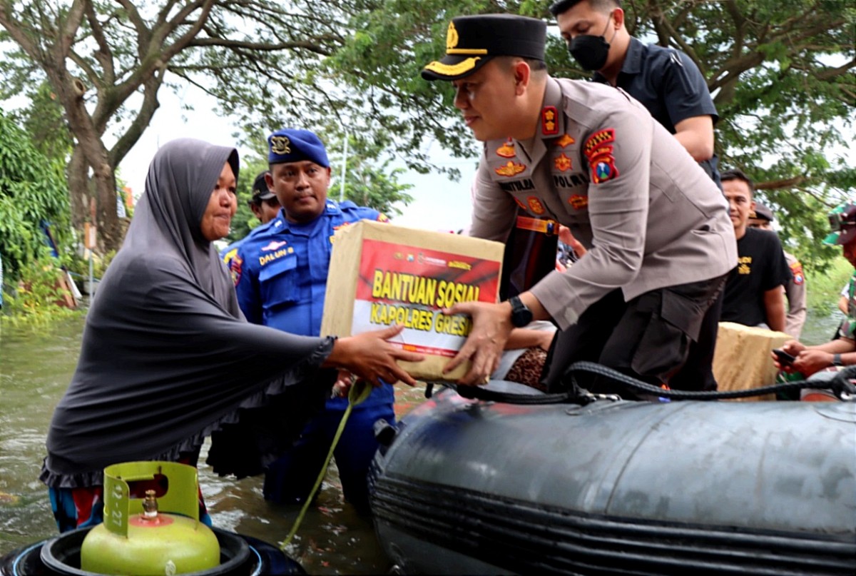 Saat memberikan bantuan, Kapolres dan Bupati Gresik menaiki perahu karet agar bisa menjangkau warga yang terdampak.