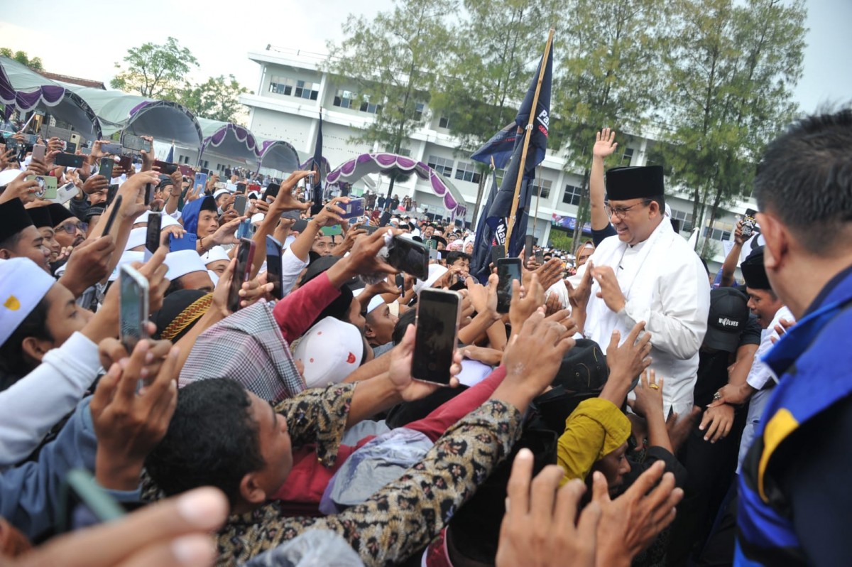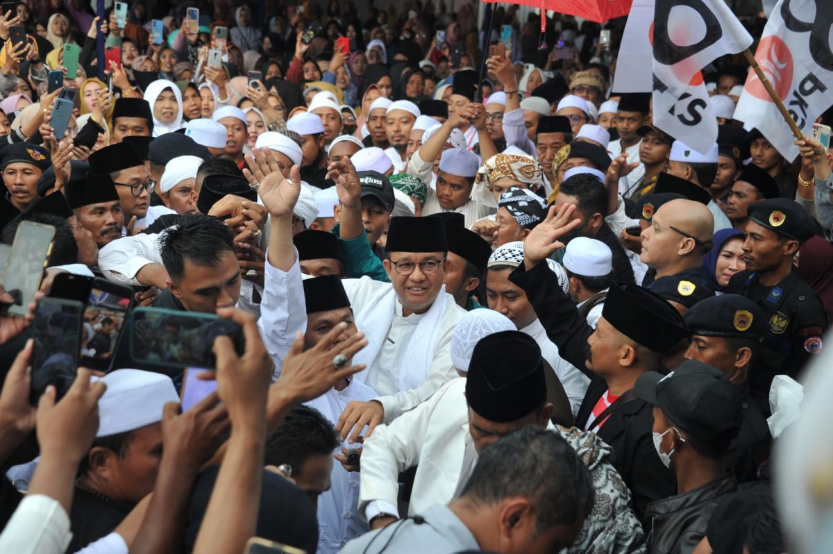 Ribuan santri dan warga setempat memadati lapangan di area ponpes. Bahkan, meski dalam kondisi hujan, para santri dan warga berdatangan dan memadati lapangan saat Anies tiba di lokasi.