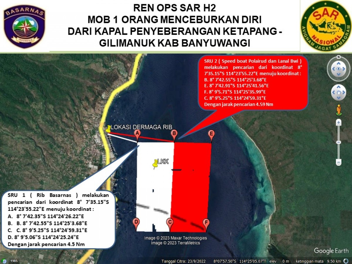 "Pukul 16.10 WIB, tim tiba di dermaga Tanjungwangi segera melaksanakan pencarian memakai RIB 03 ke titik LKK. Dilanjut pencarian ke arah selatan dengan radius pencarian 5 - 6 nautical mile (NM)," jelasnya.