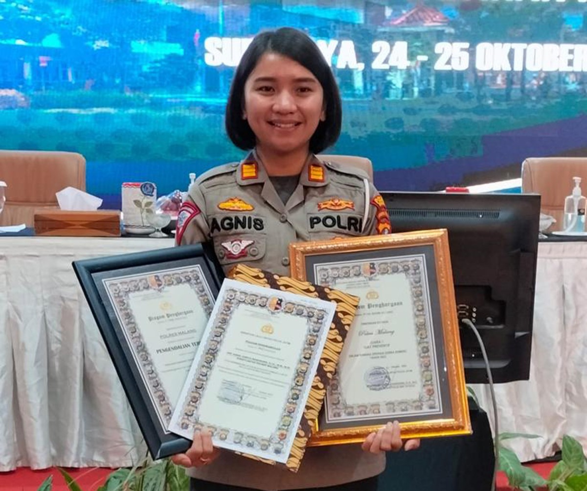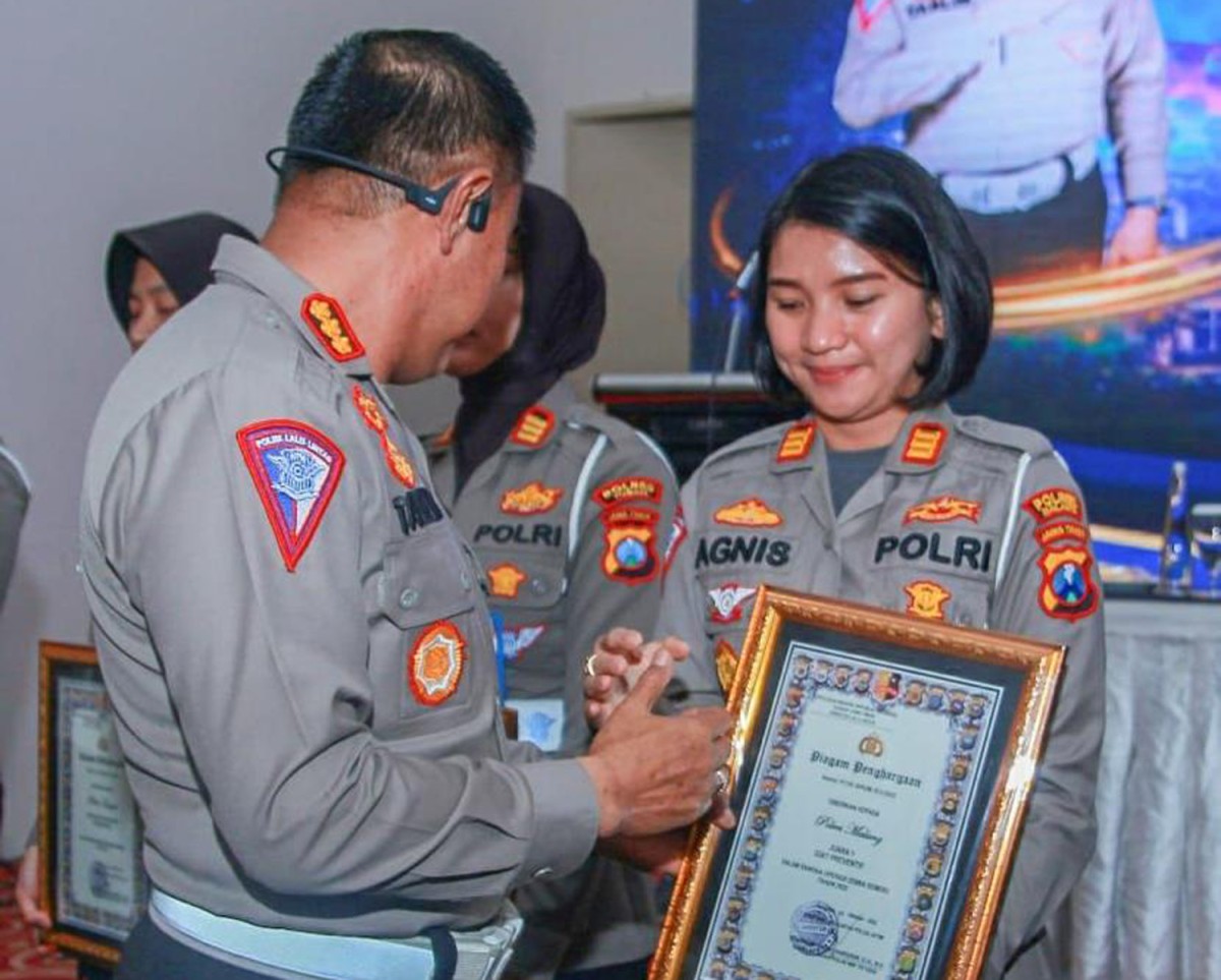 Penghargaan yang diraih AKP Agnis itu diterima polwan berprestasi dalam kegiatan analisis dan evaluasi kinerja Ditlantas serta jajaran Polda Jatim.