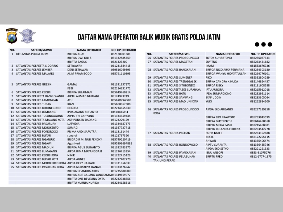 Sehingga agar program bisa segera terealisasi Taslim telah meminta kepada satuan lalu lintas Polres jajaran Polda Jatim supaya menyediakan nomor hotline agar memudahkan masyarakat dalam mencari informasi mudik balik gratis.